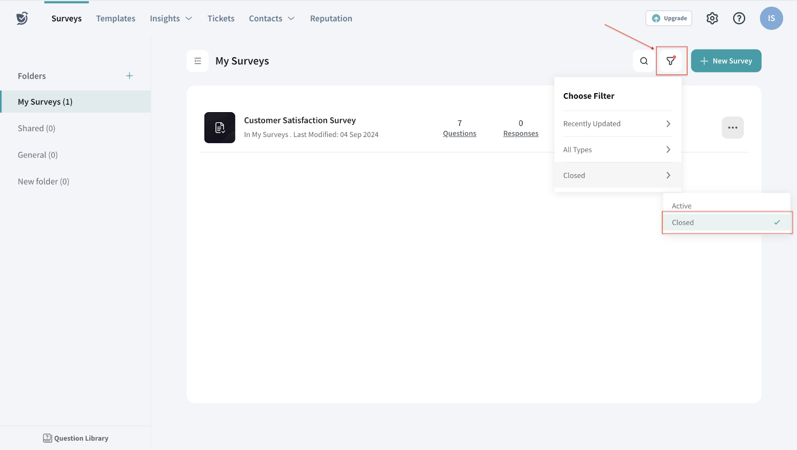 2. If you wish to delete the survey, change the filter from 'Active' to 'Closed.' Once you apply this filter change, you will notice a red dot indicating that the survey filter has switched from 'Active' to 'Closed.'