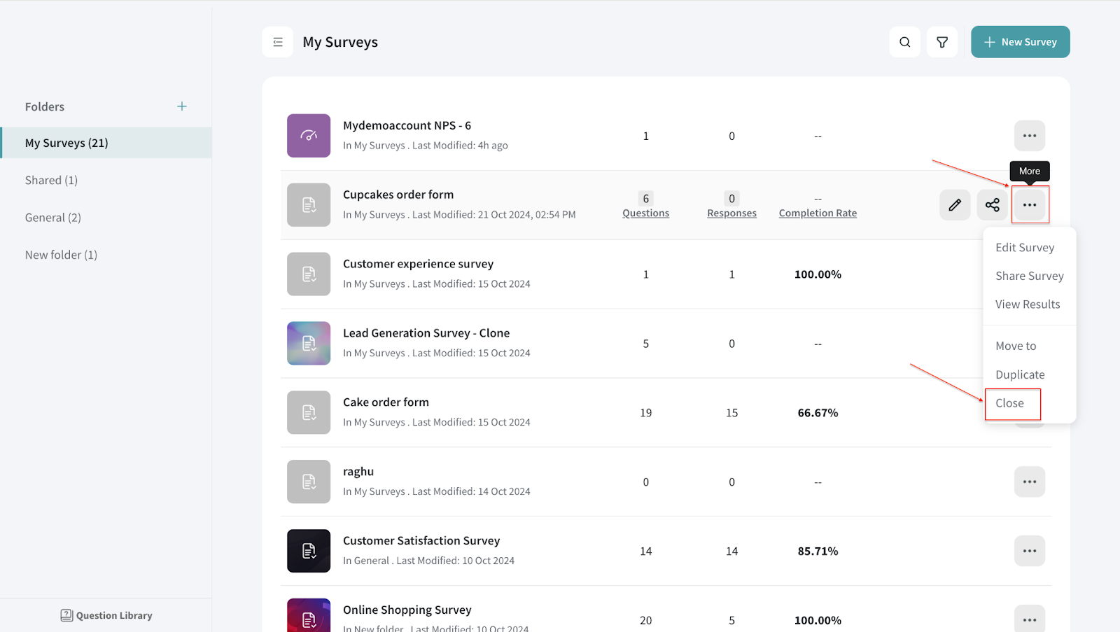 1. Close the survey by clicking on the ellipsis (...) and selecting the "Close" option. This action will move the survey to the 'Closed' surveys folder, rendering it inactive.