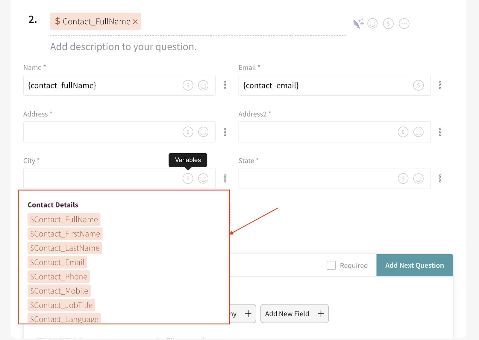 - You can also prefill address, company name, and phone number fields, but ensure that these fields are available in the Contact Management column or as previous questions so that the data can be pulled into the contact form.