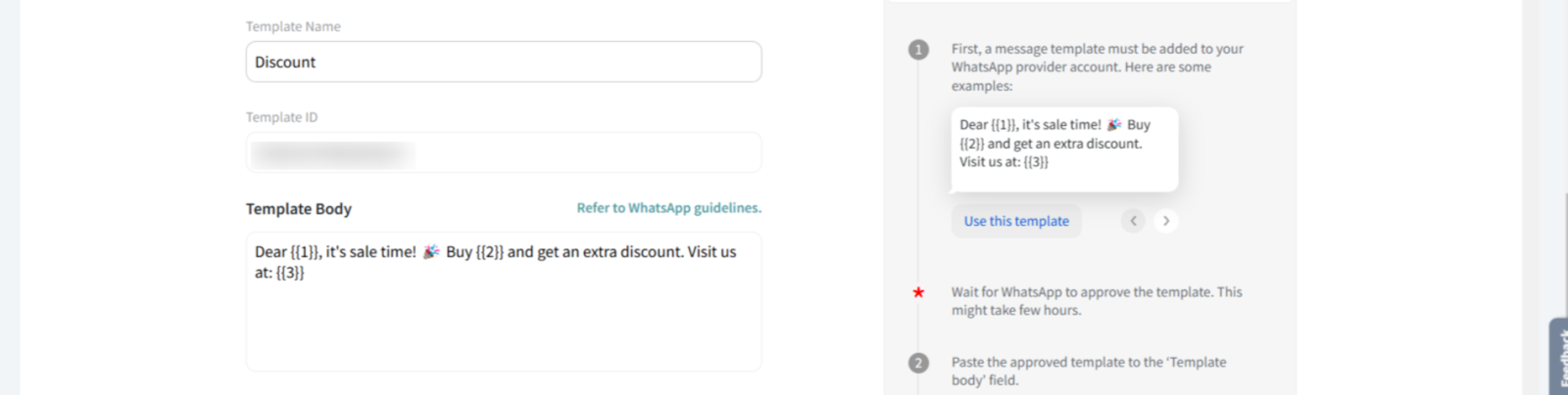 4. Enter the Template Name and Template ID as configured in your WhatsApp Business Service Provider account.