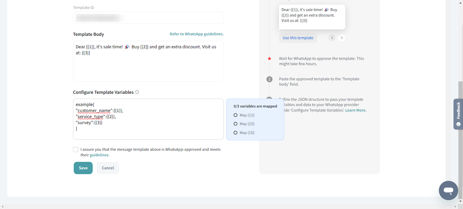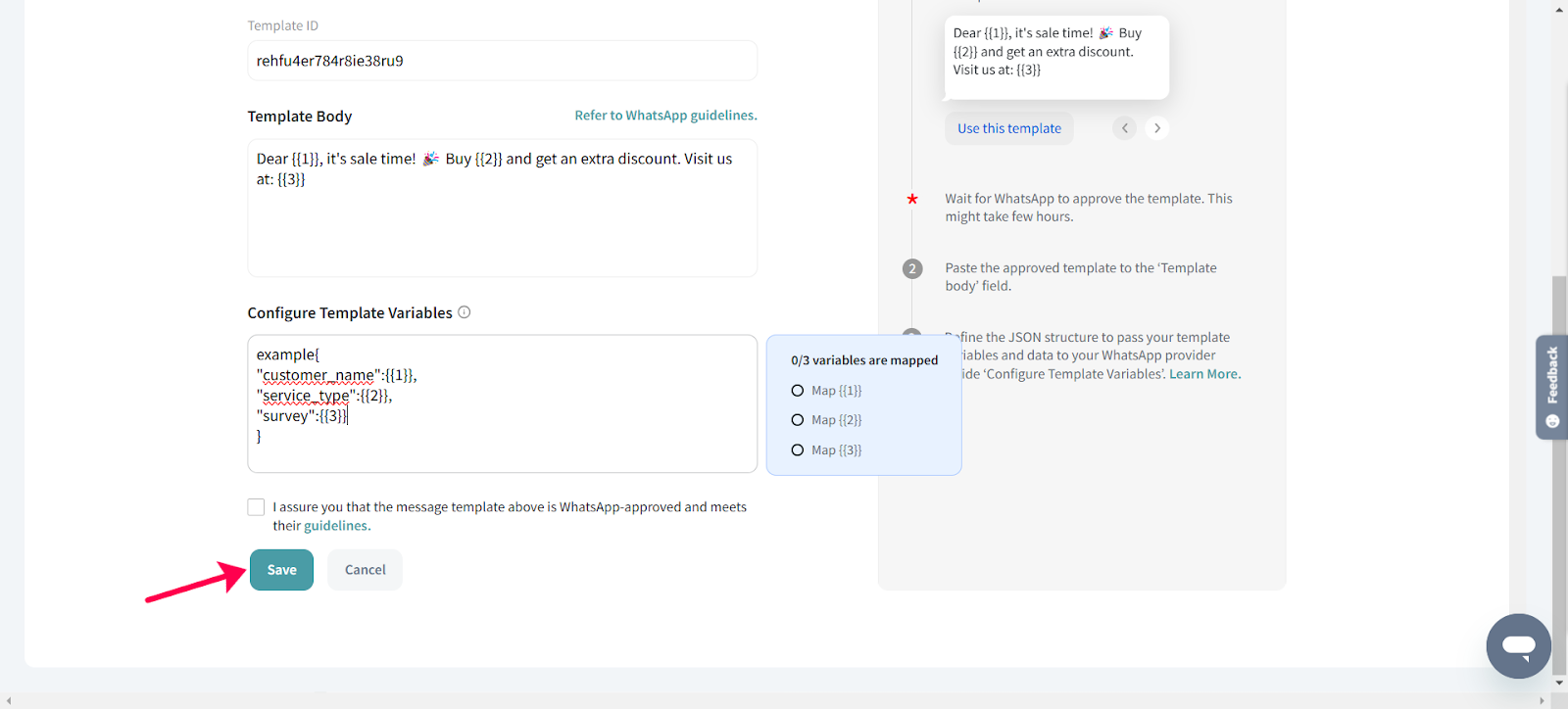 7. Once you confirm that your message template complies with the WhatsApp-approved guidelines, click Save.