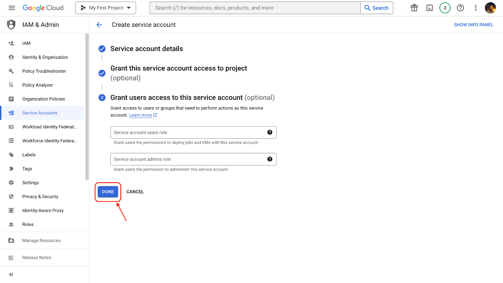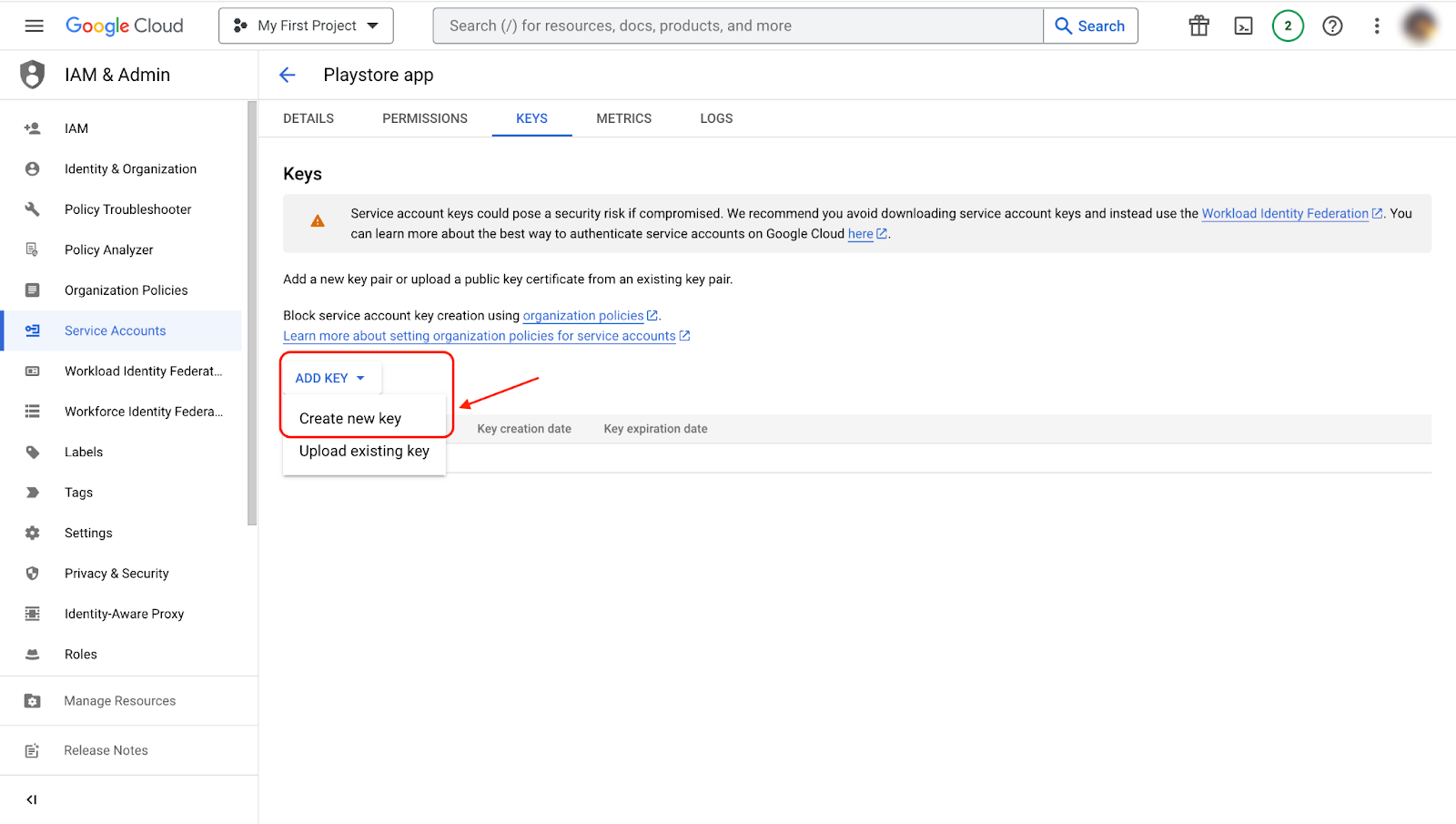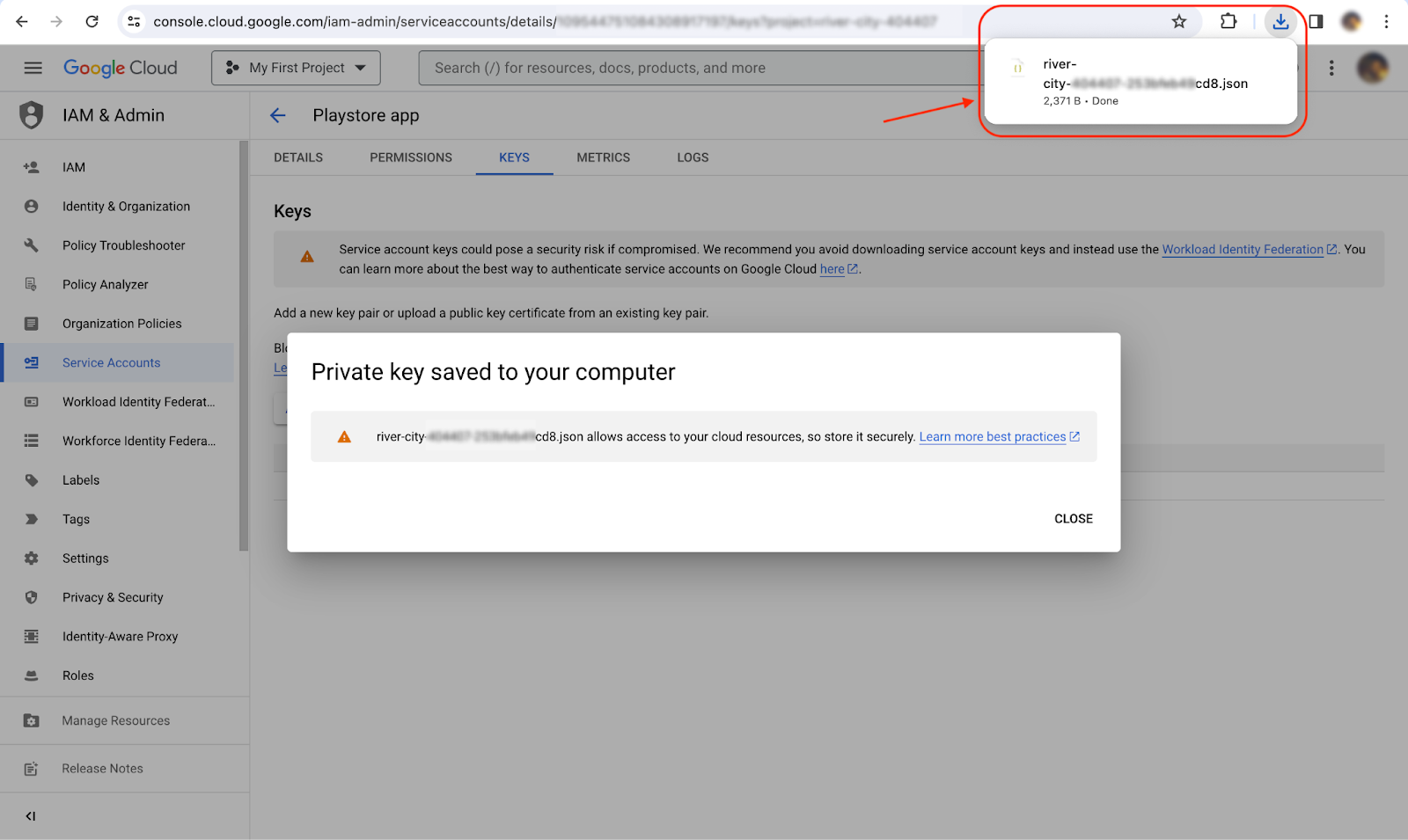 - Ensure you save the JSON file containing the private key details securely since you can download it only once
