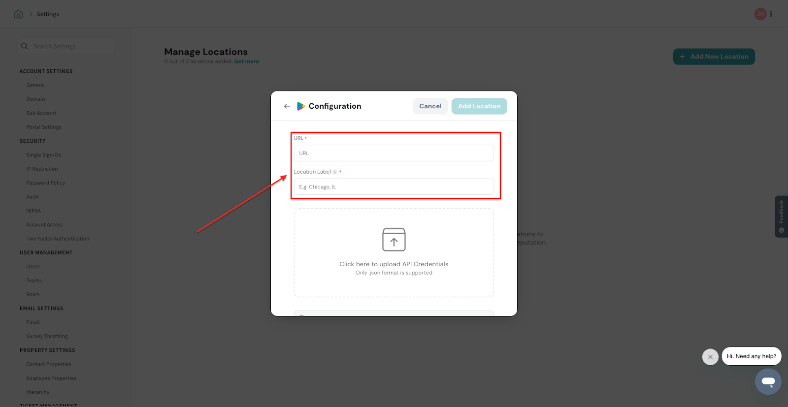 7. Upload the JSON file containing your Service account’s private key details, which was created and downloaded after creating the Service account.