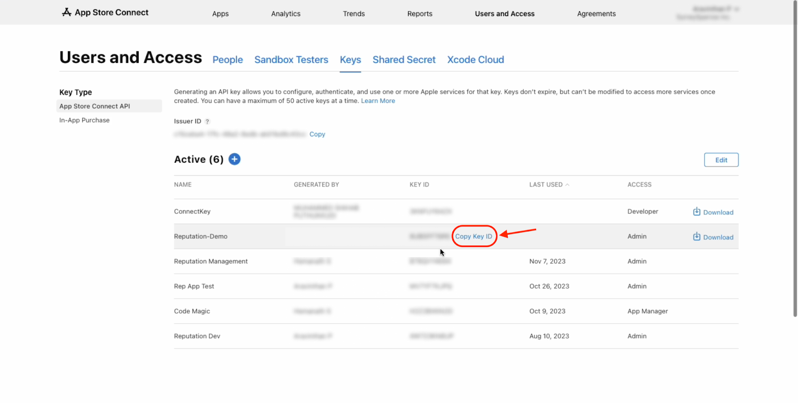 6. Copy the generated key ID and have it ready to connect your app with SurveySparrow’s Reputation Management.