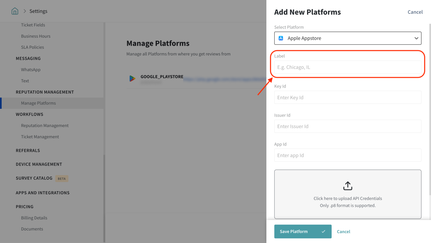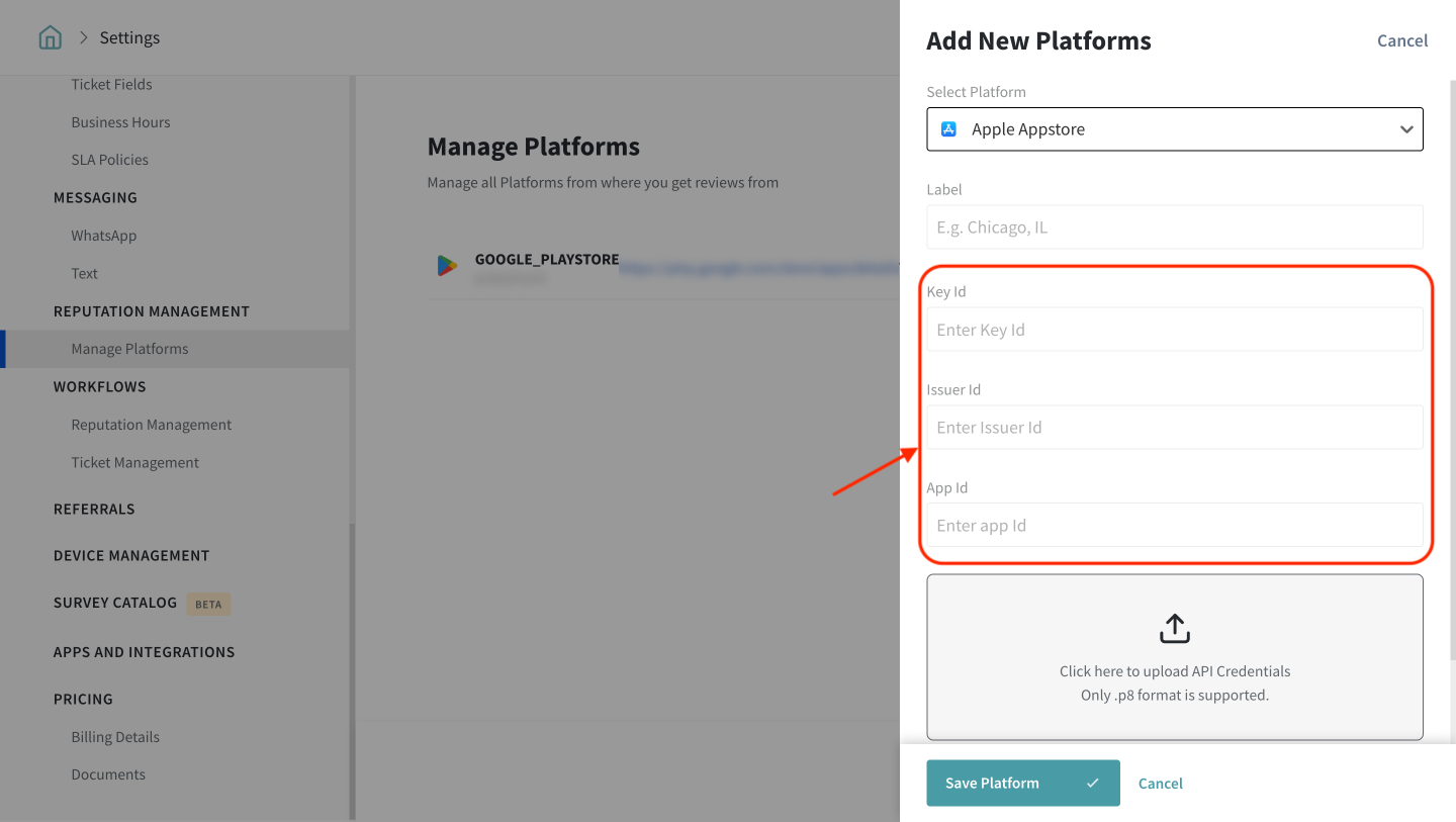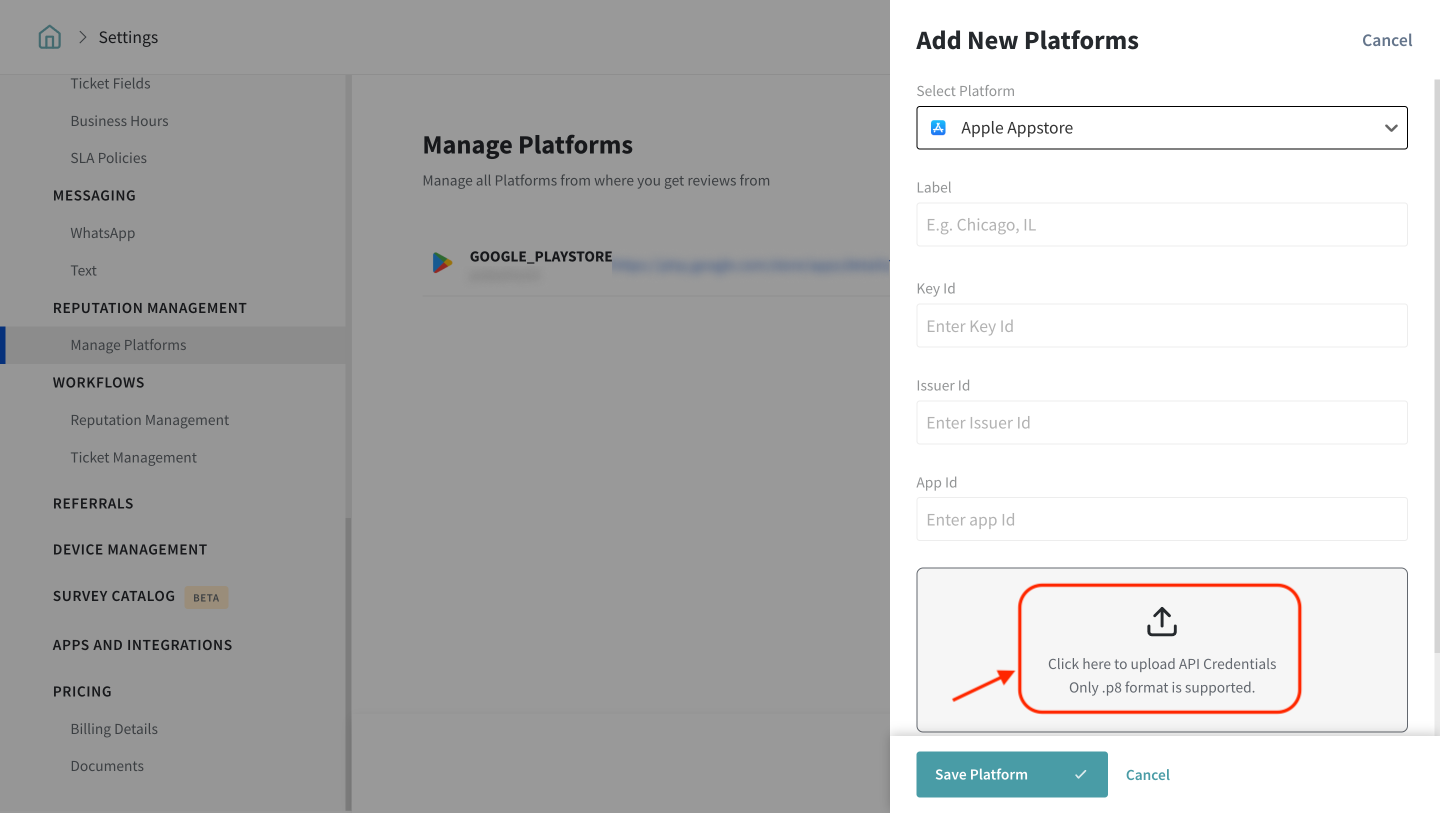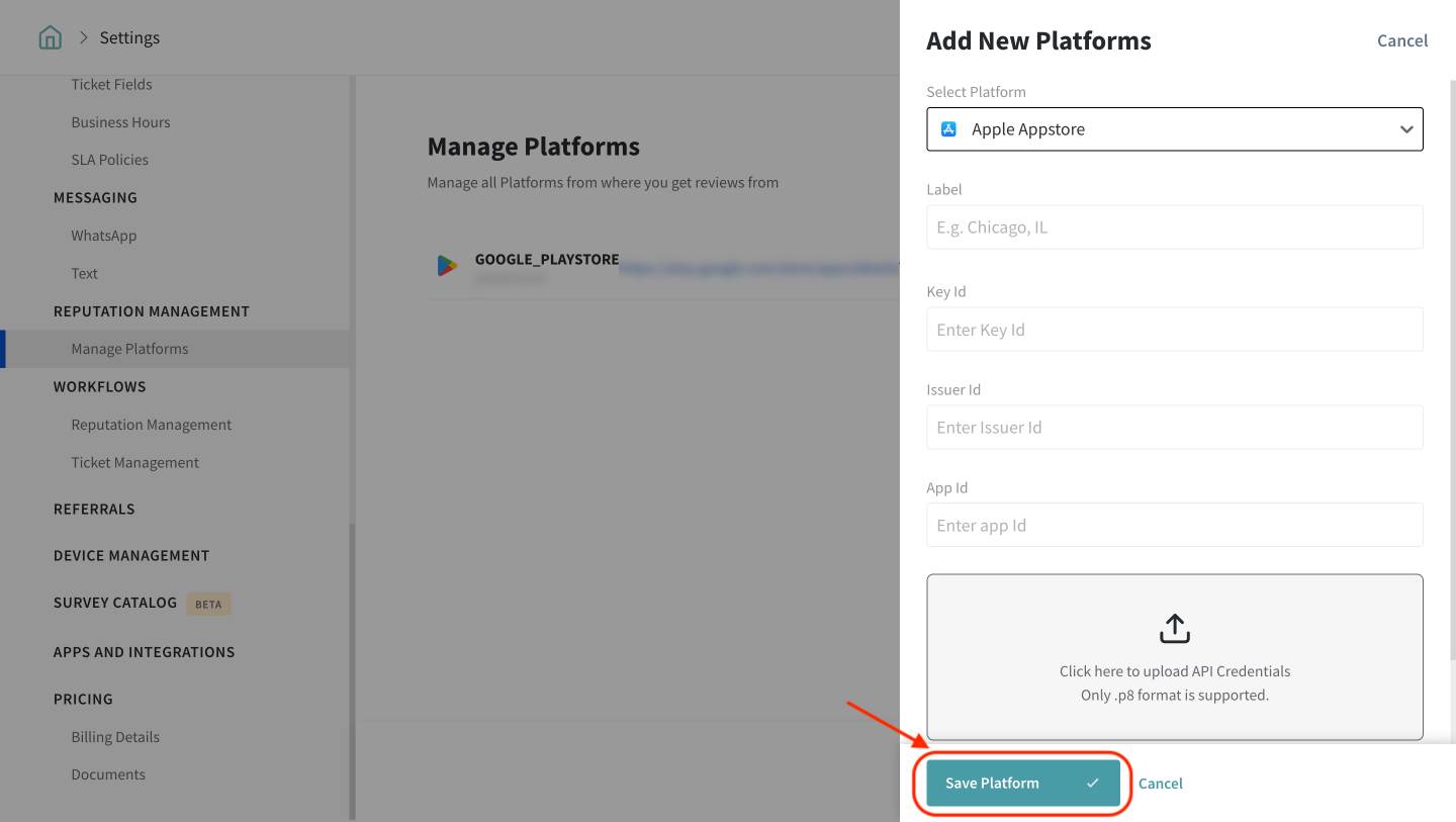 7. Upload the API credentials generated from your Apple App Store Connect account. Please refer to the above section to generate API credentials.