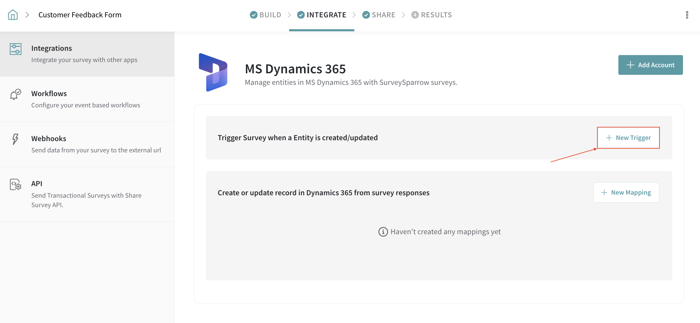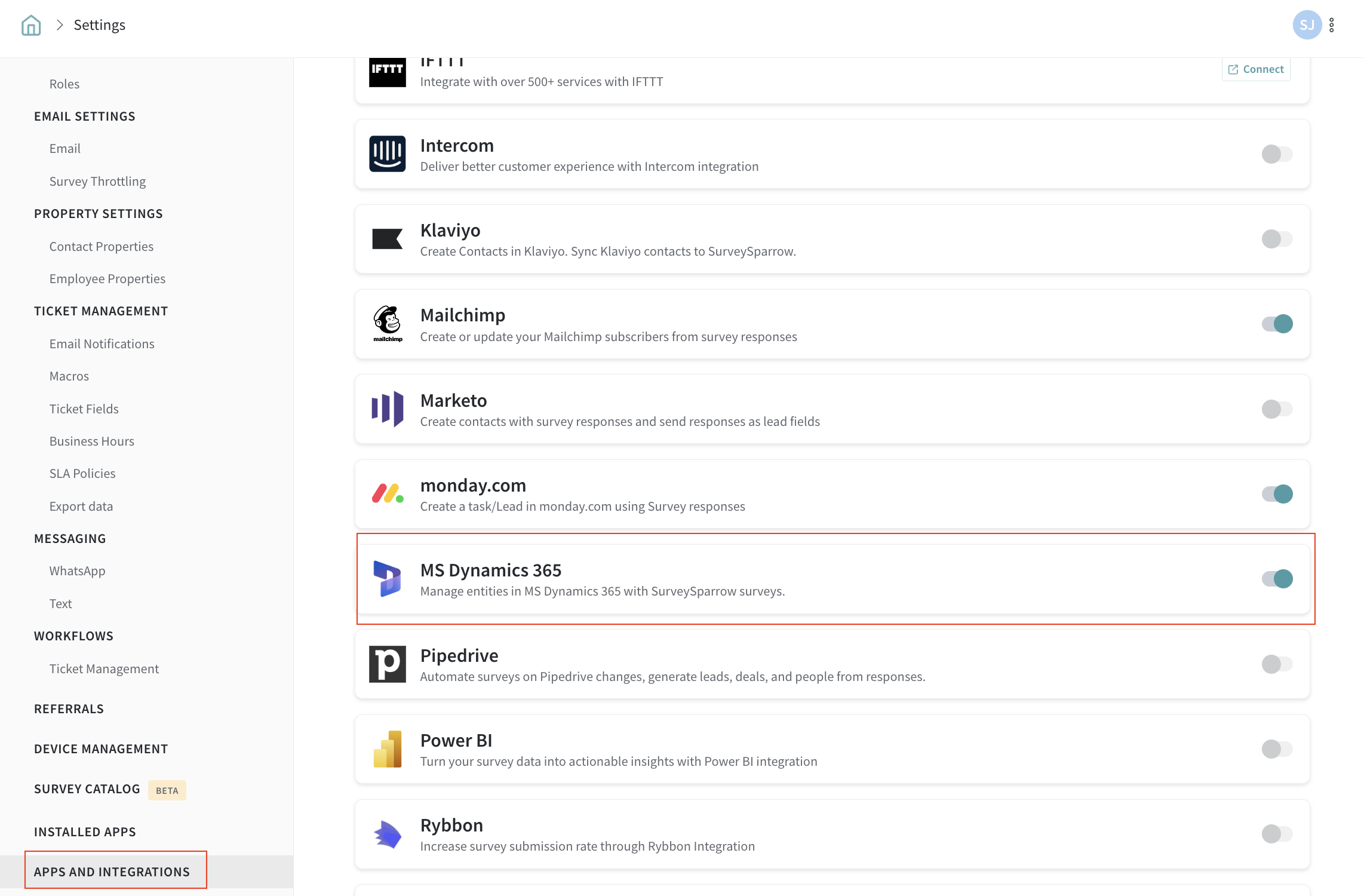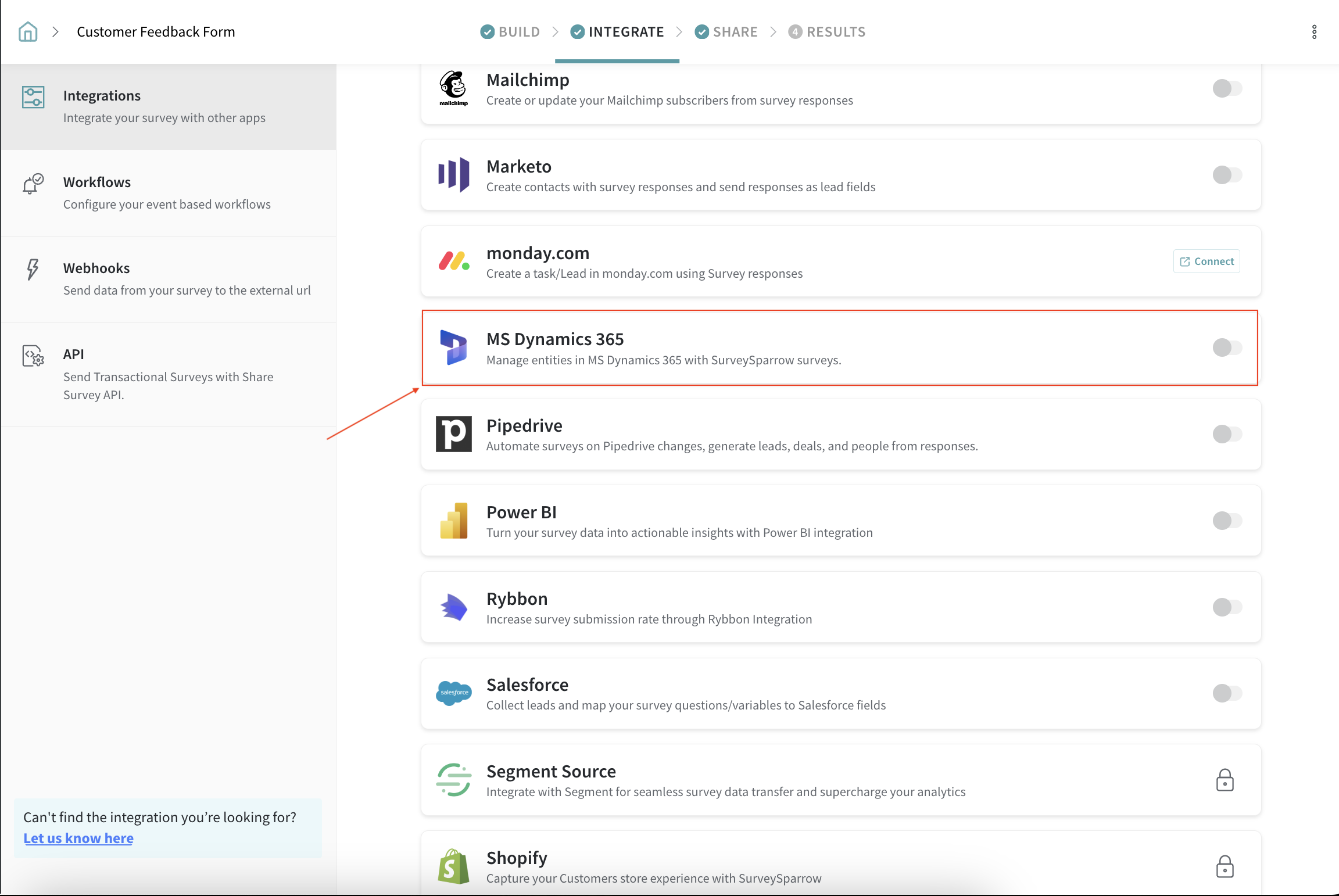 1. Navigate to the Integrate section of a survey and click MS Dynamics 365.