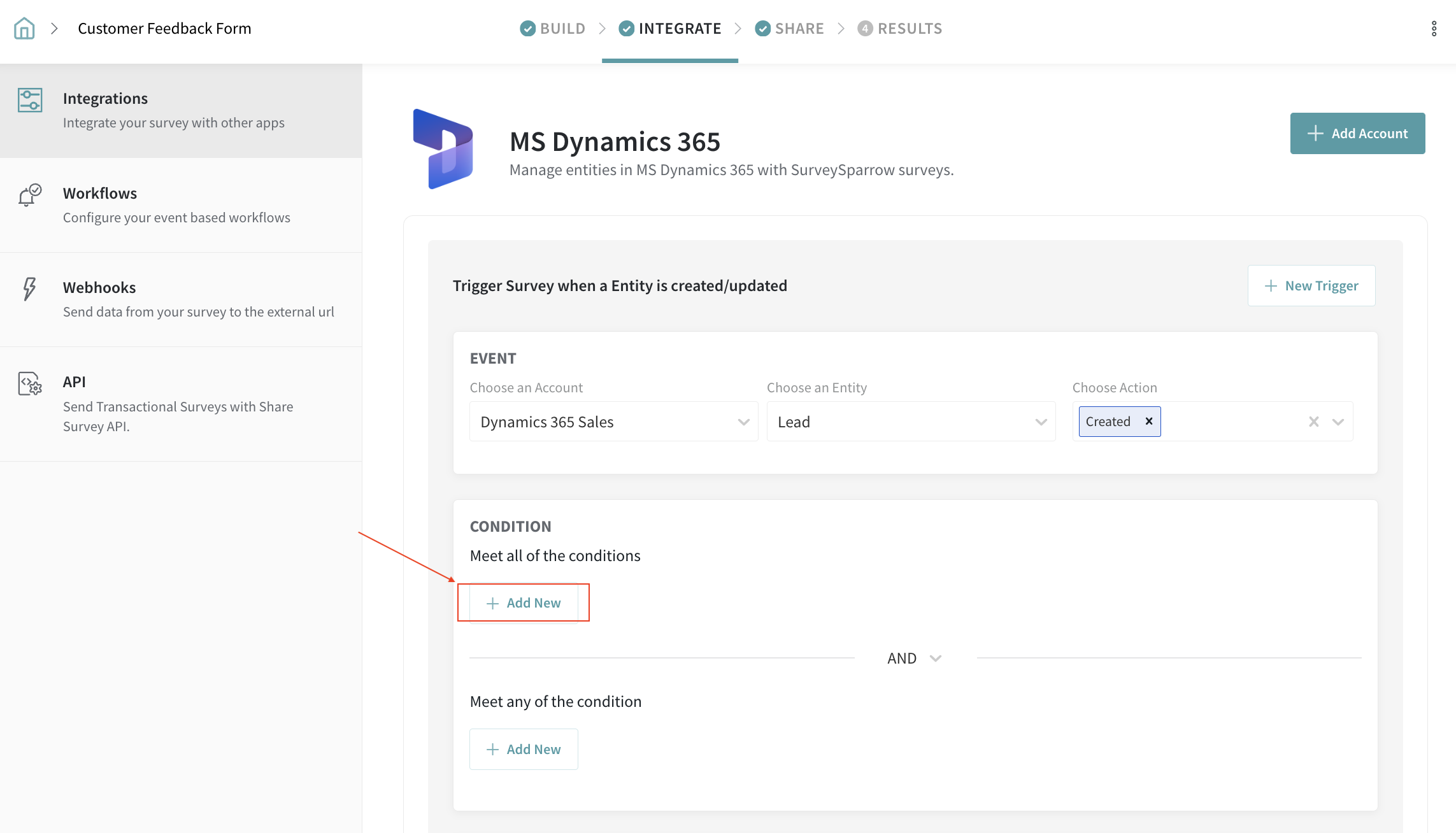 6. You can now add conditions for which the survey has to be triggered. Click Add New.
