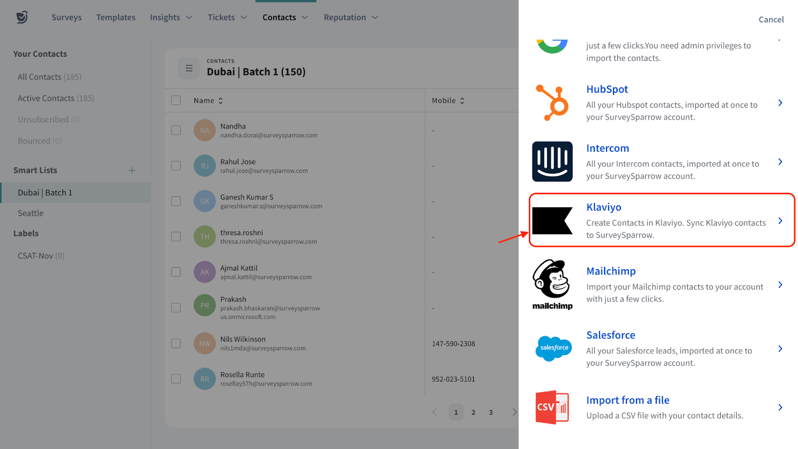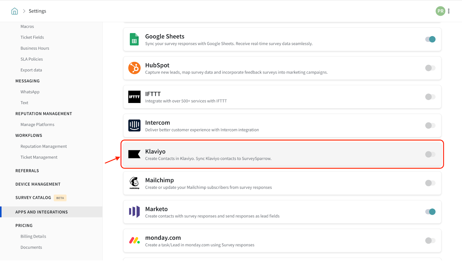 Integrating Klaviyo with a Customer Experience Management(CXM) platform is significant for ensuring a unified and compelling customer journey. The Klaviyo-SurveySparrow integration empowers businesses to capture leads and seamlessly sync contact information with the platform to run customer experience programs.
