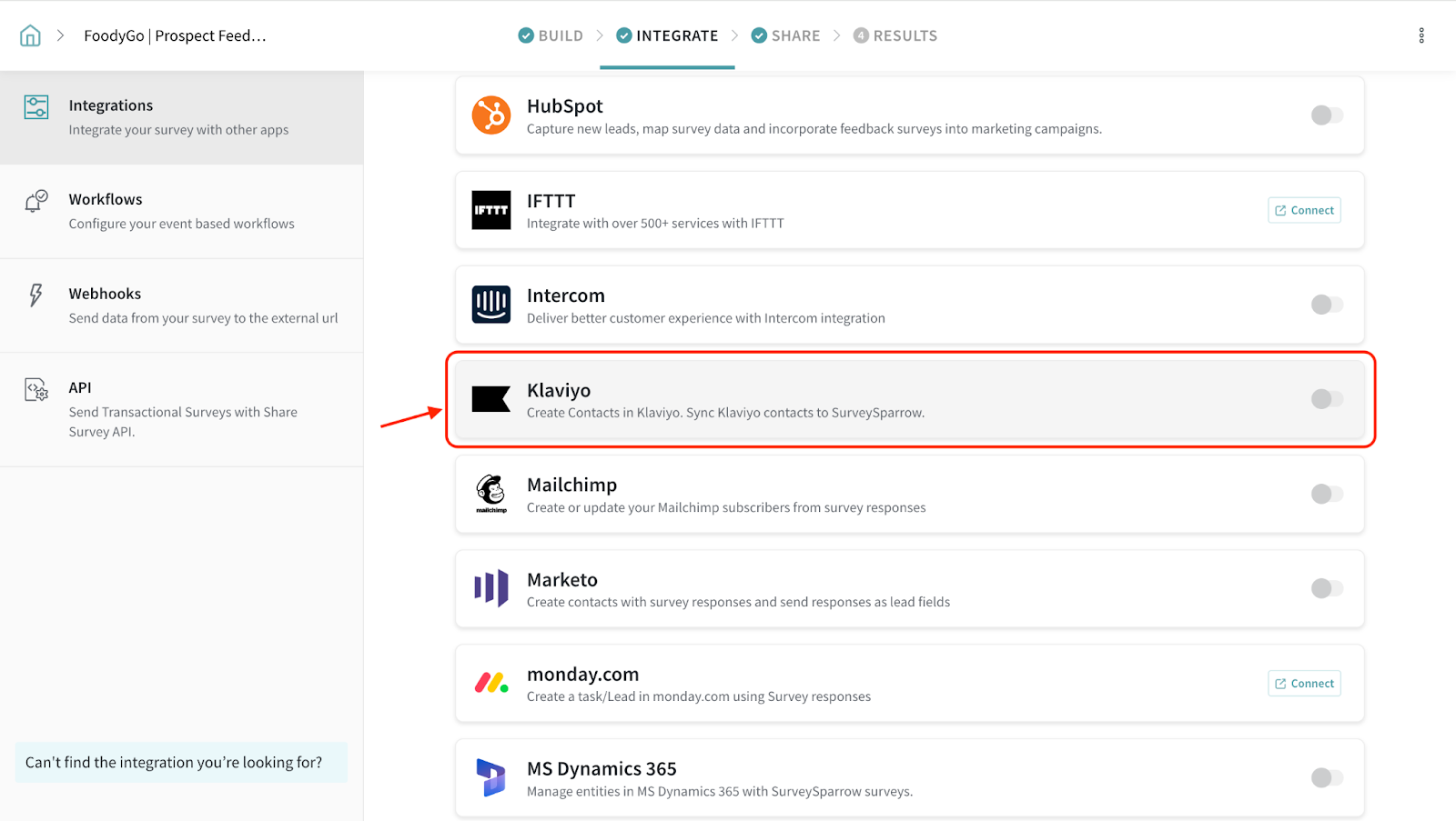 1. Navigate to the Integrate section of a survey whose responses you’d like to pass to Klaviyo.