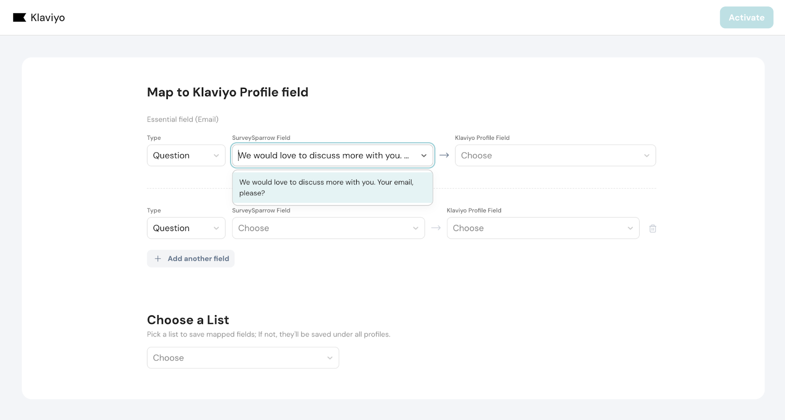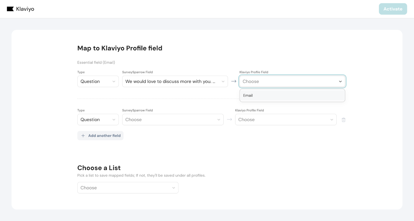2. It’s mandatory to send email data to Klaviyo. Choose the corresponding field from SurveySparrow.