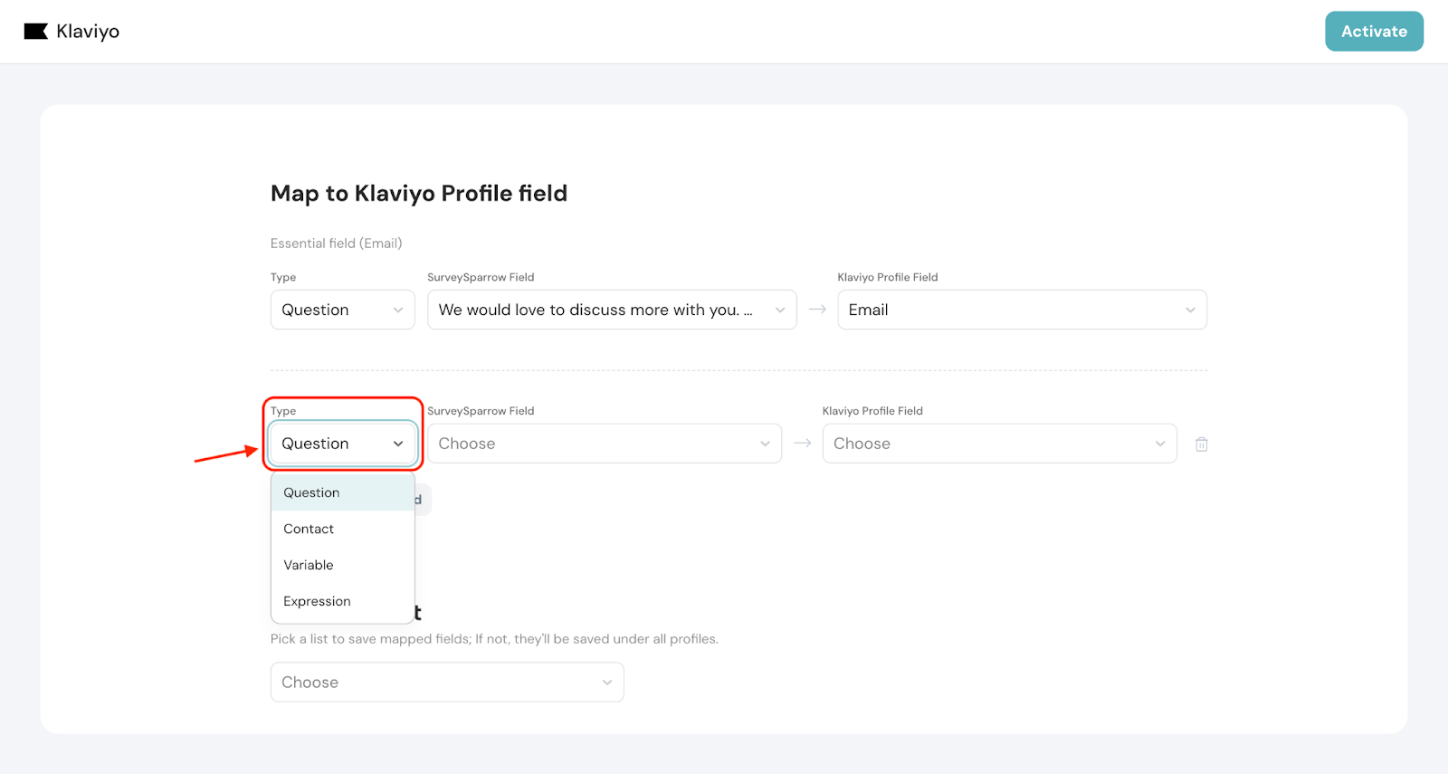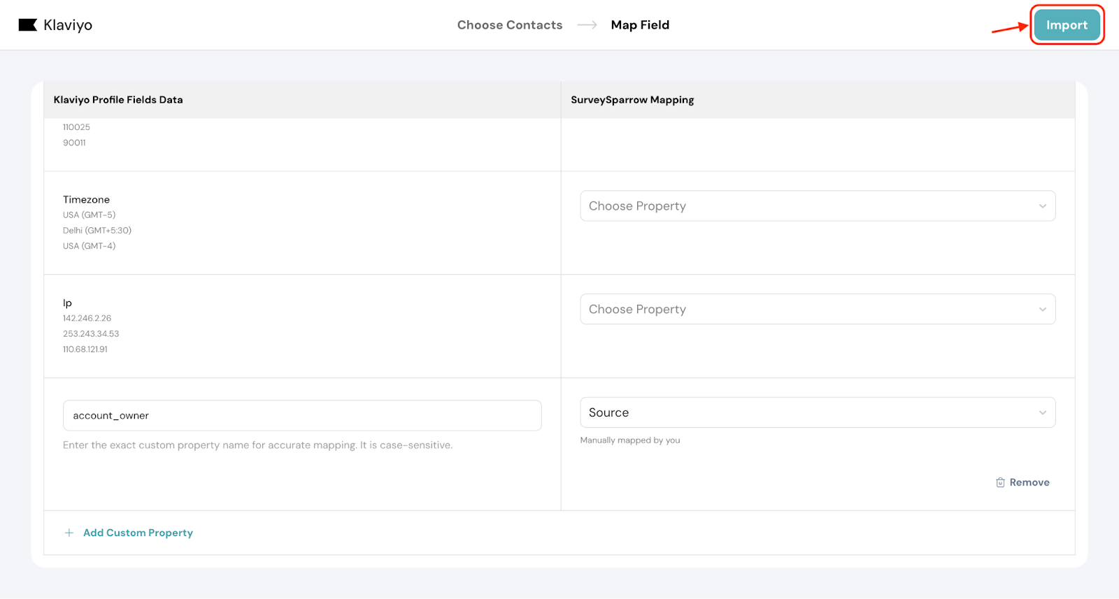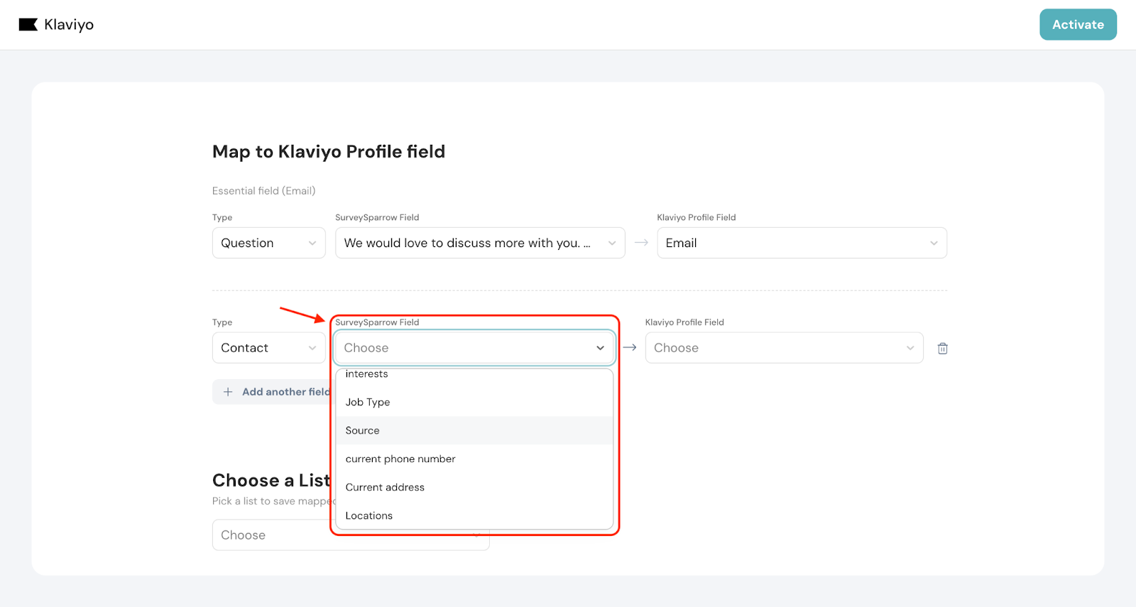 7. Map the Klaviyo profile fields to SurveySparrow’s contact fields.