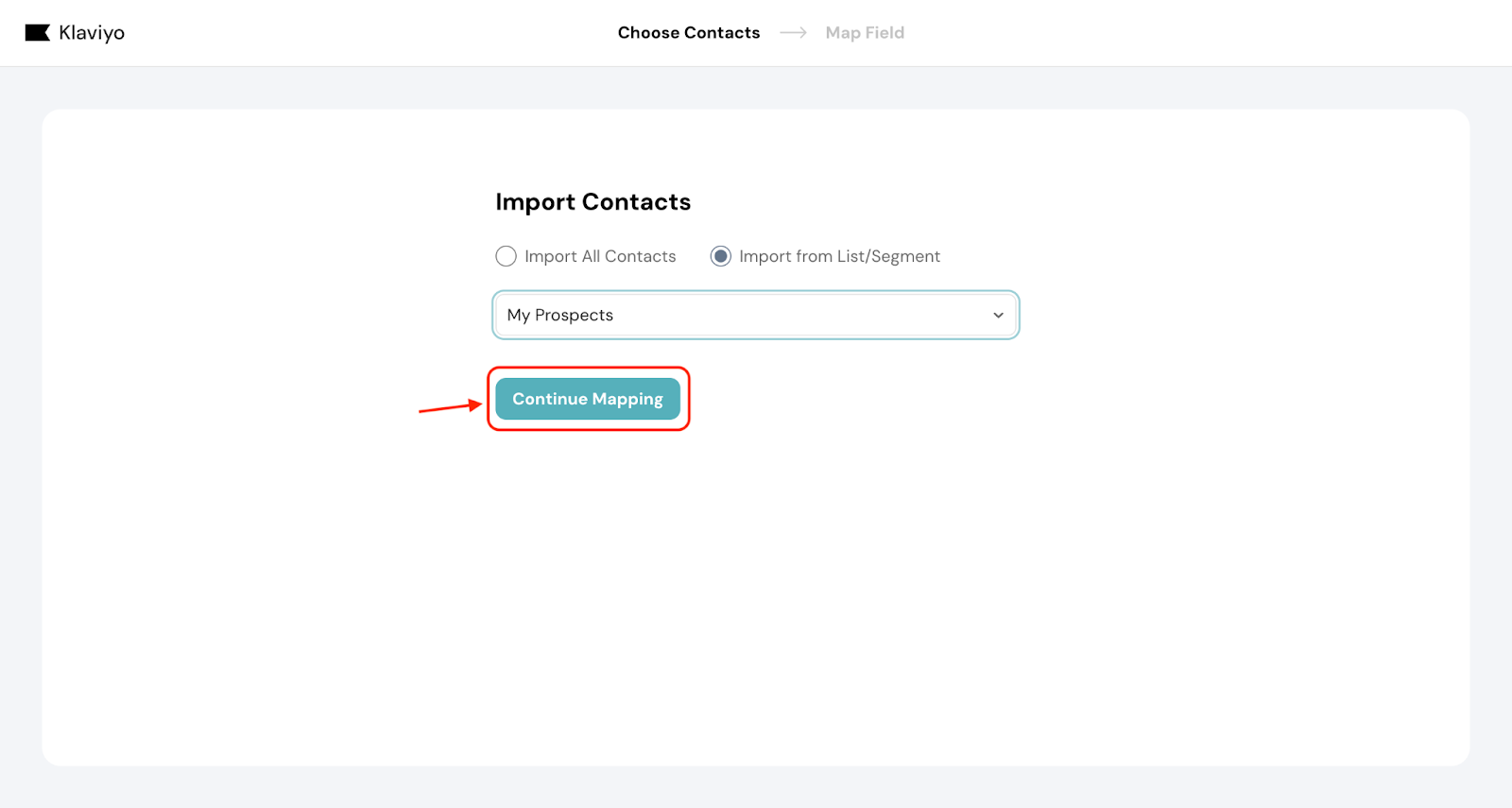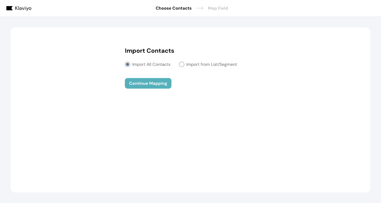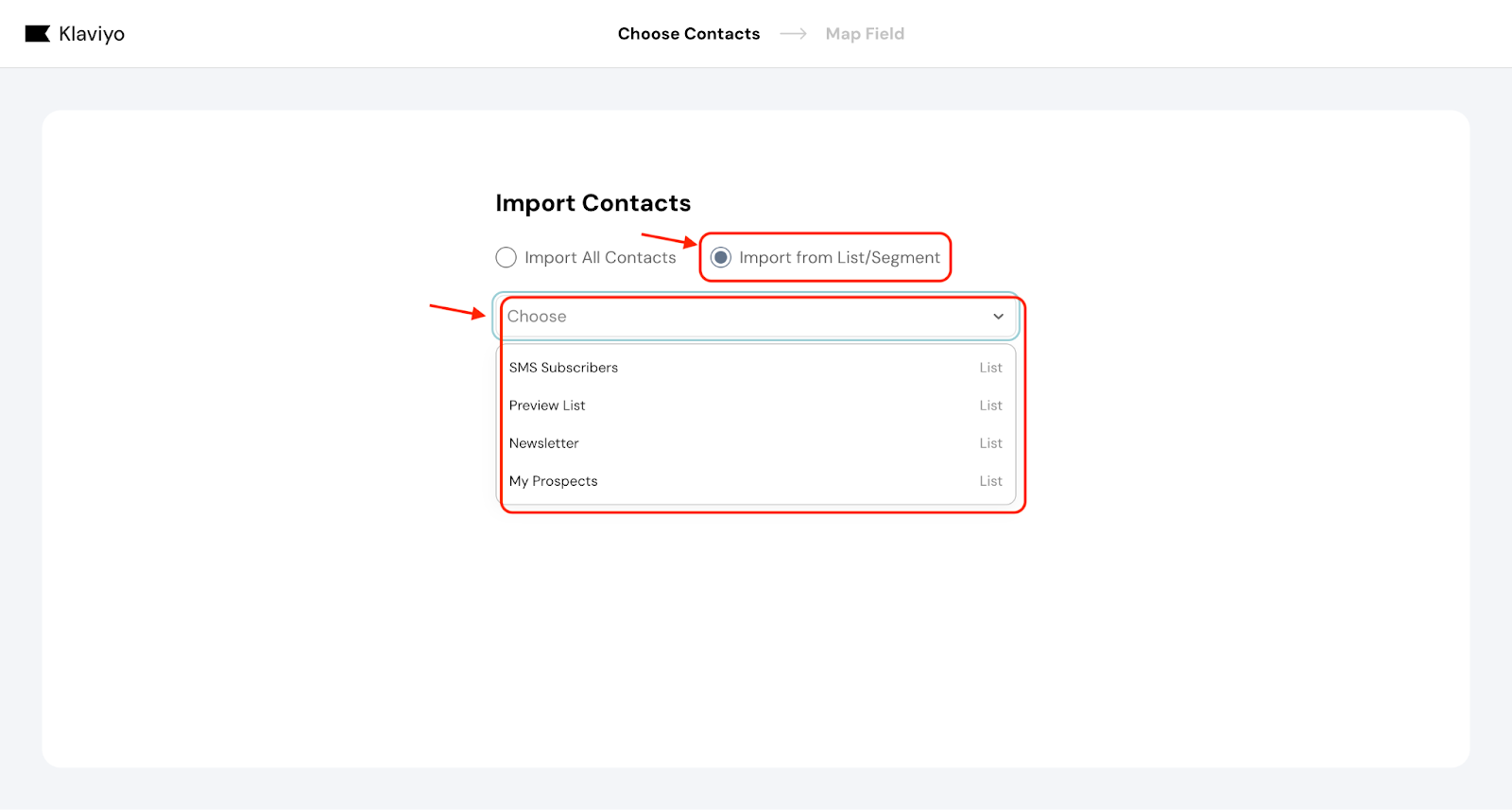 4. You can choose to import all the contacts or choose from a specific list or segment from Klaviyo.