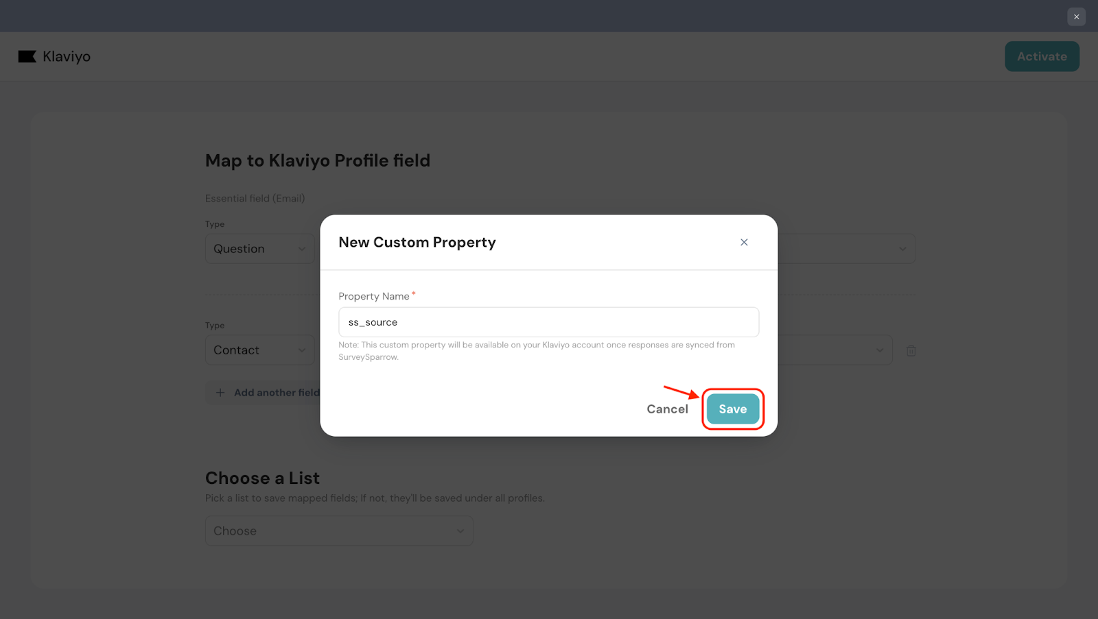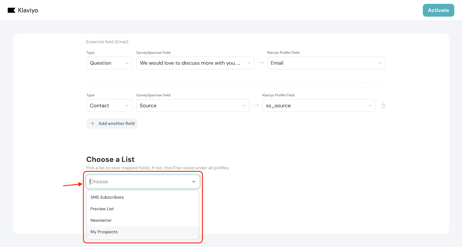 7. Choose a list on Klaviyo to sync the data from SurveySparrow.
