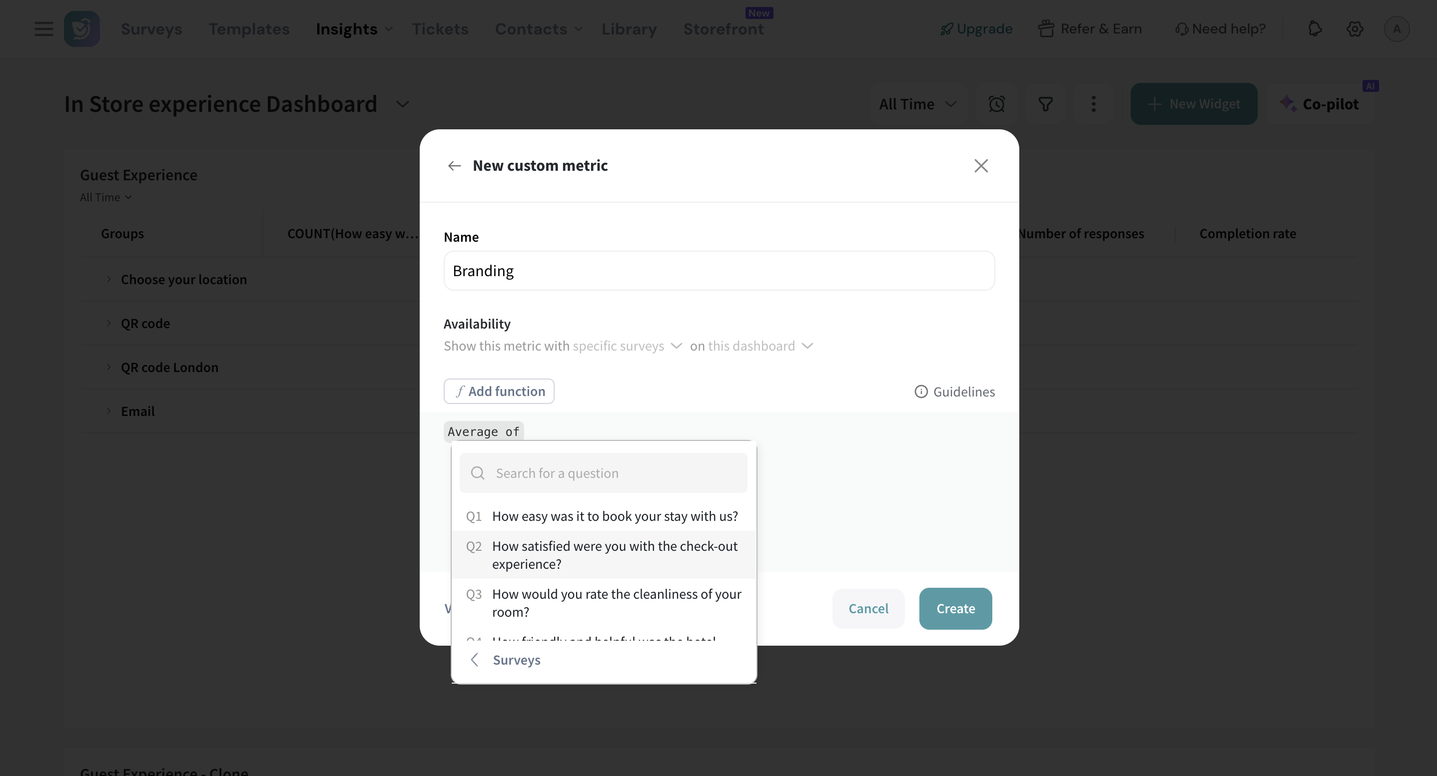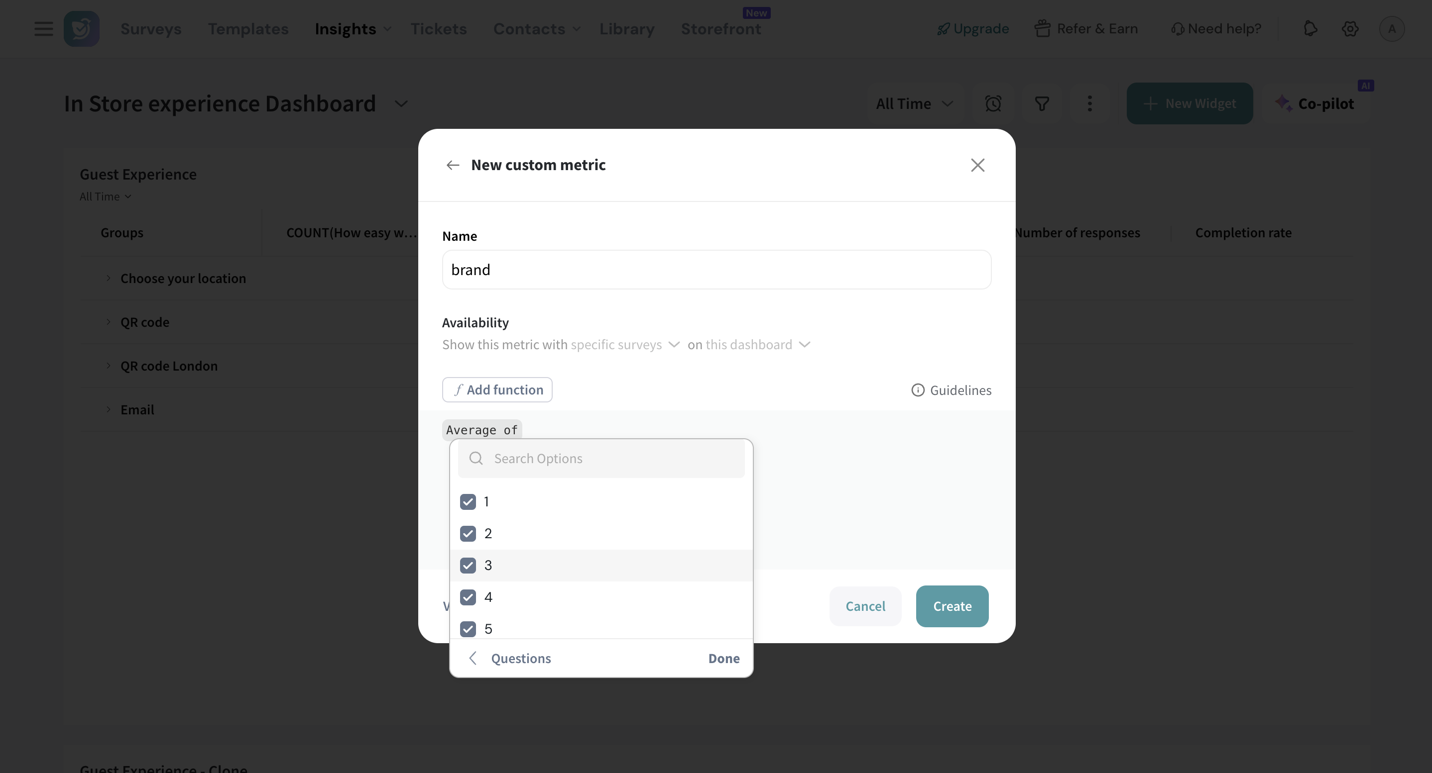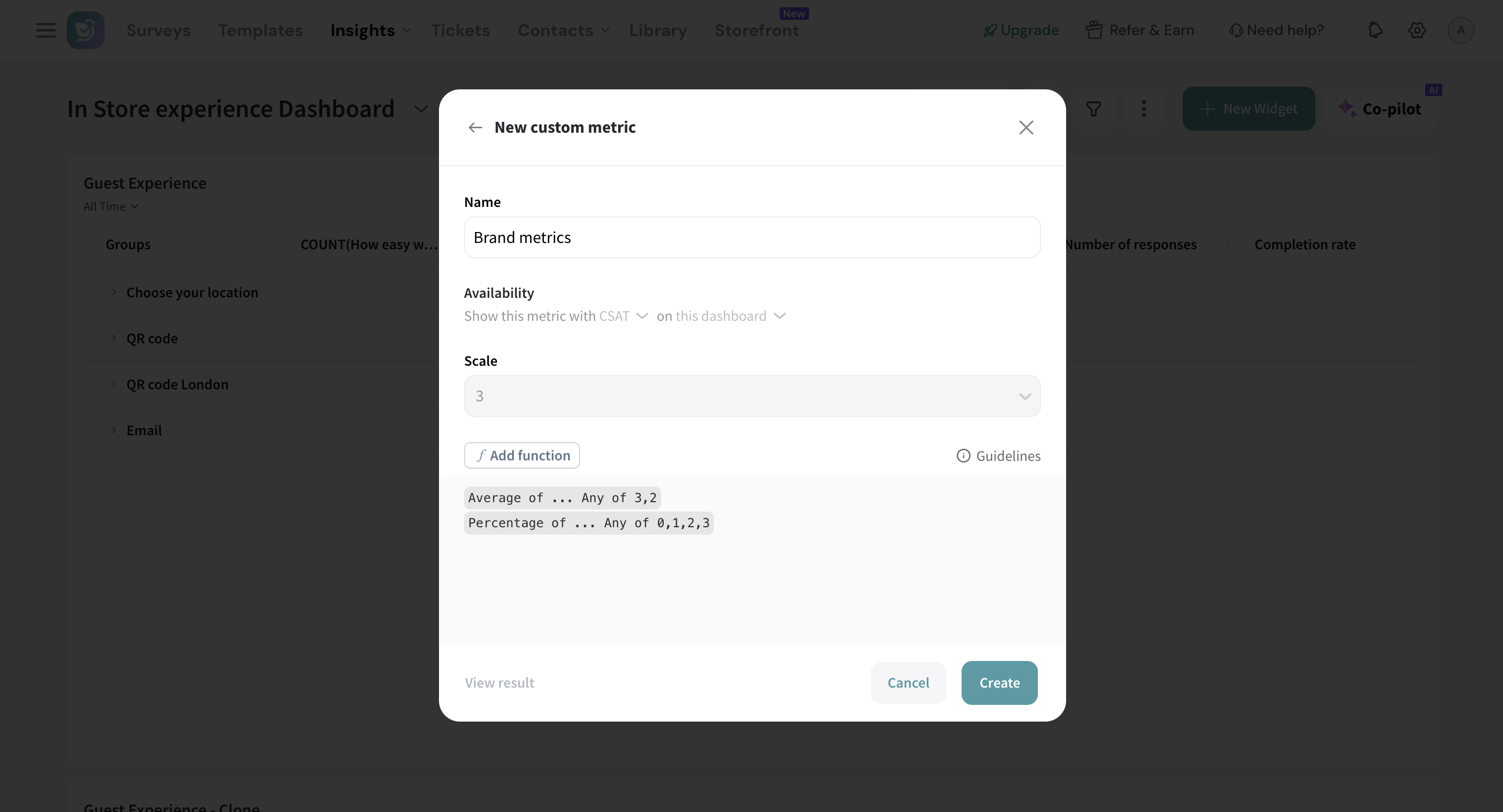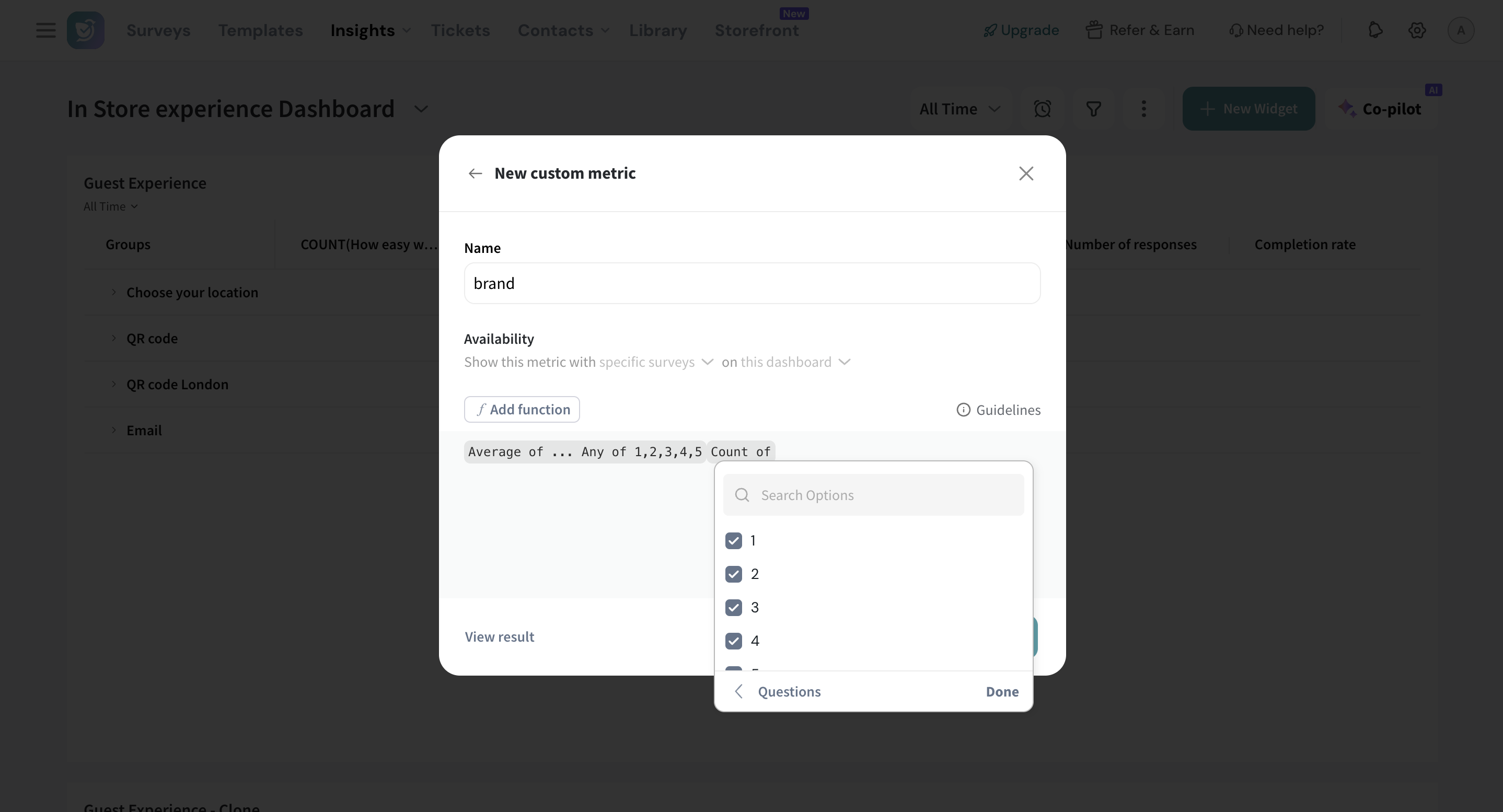 - Custom metric (Already defined custom metrics will be available as a function for creating a custom metric with questions from specific surveys)