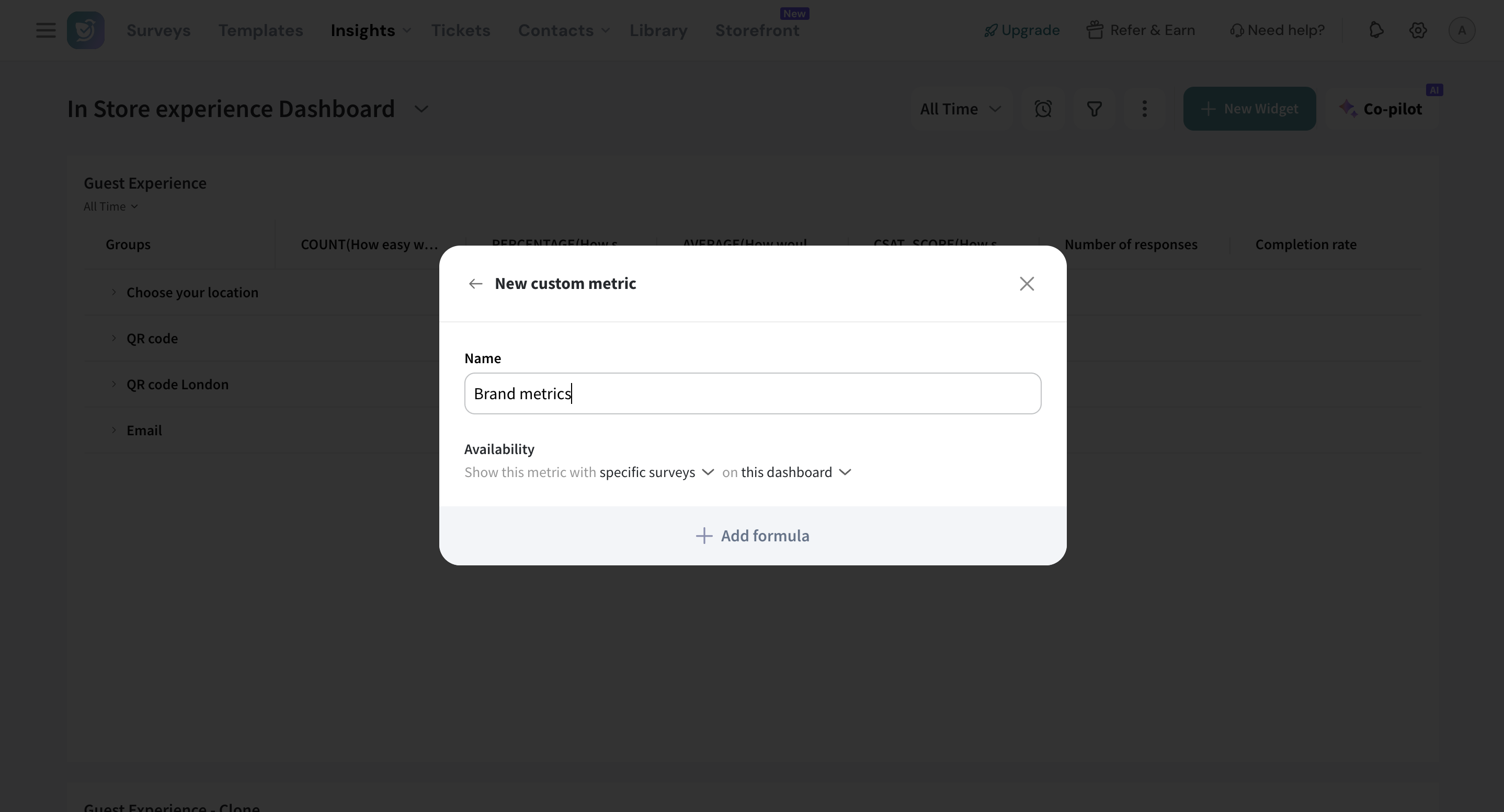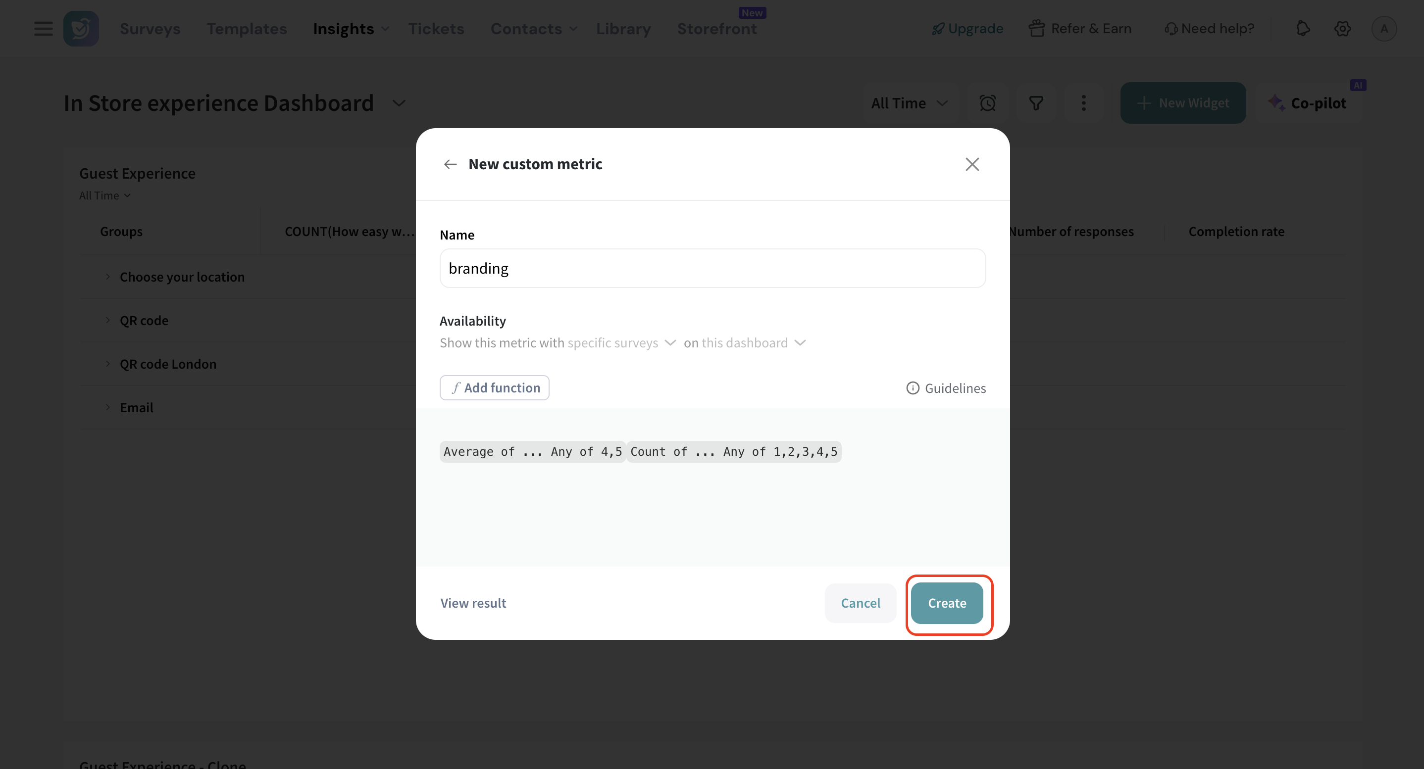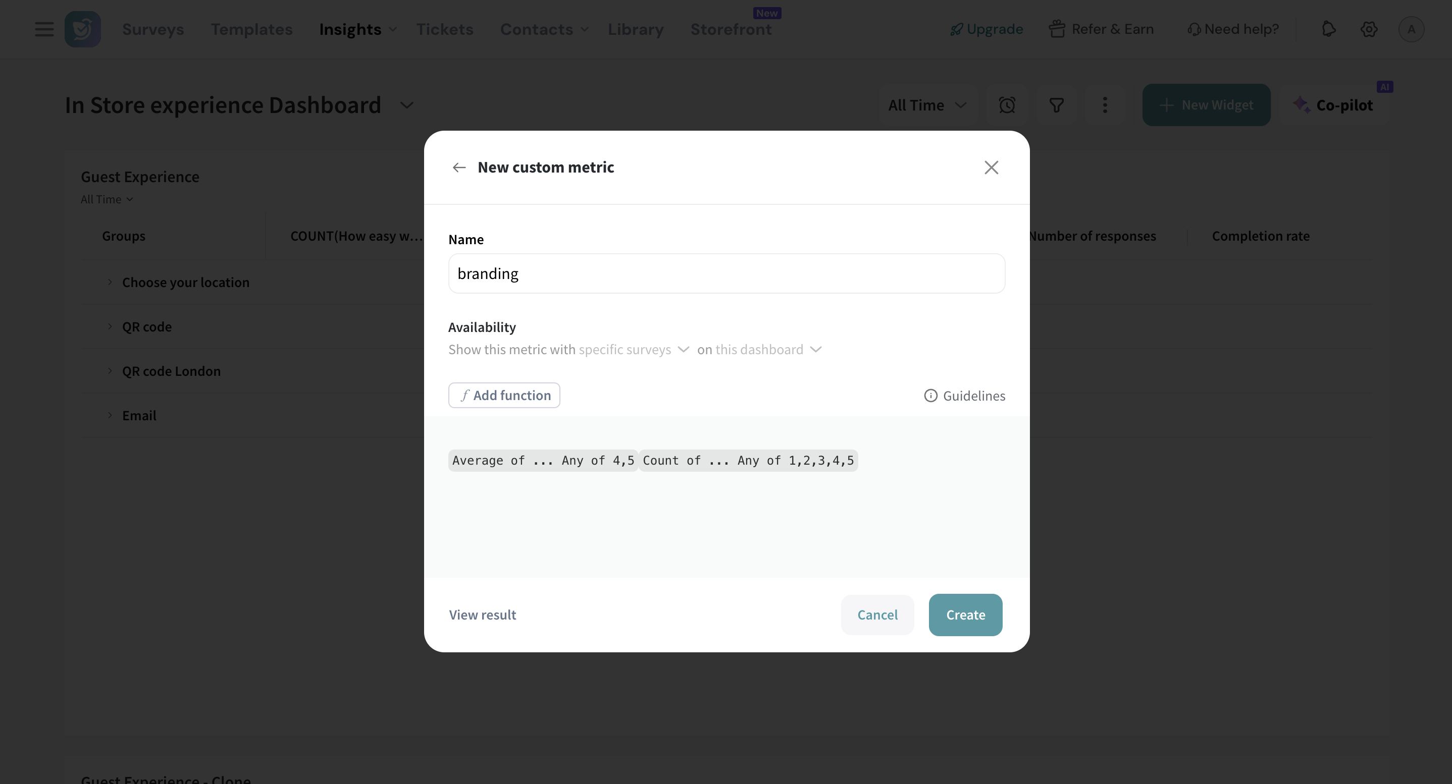 - Custom metric (Already defined custom metrics will be available as a function for creating a custom metric with questions from specific surveys)