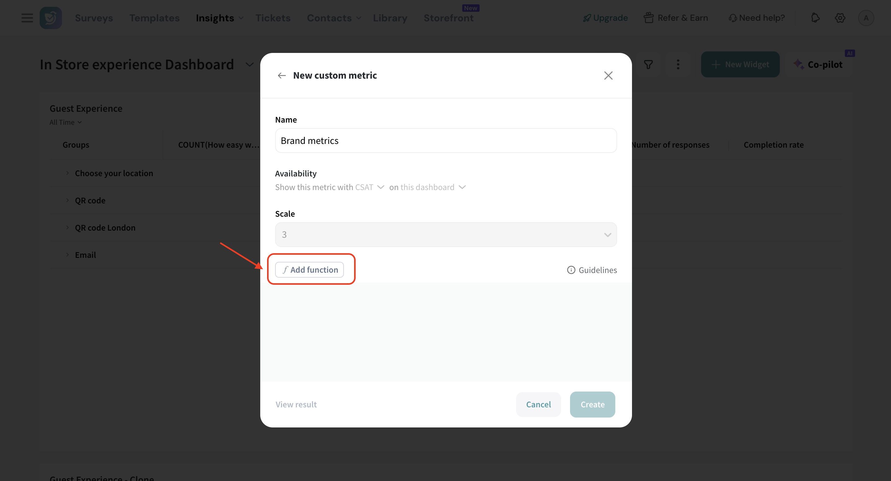 4. Type ‘f’ or click Add function to start building the formula for your custom metric.