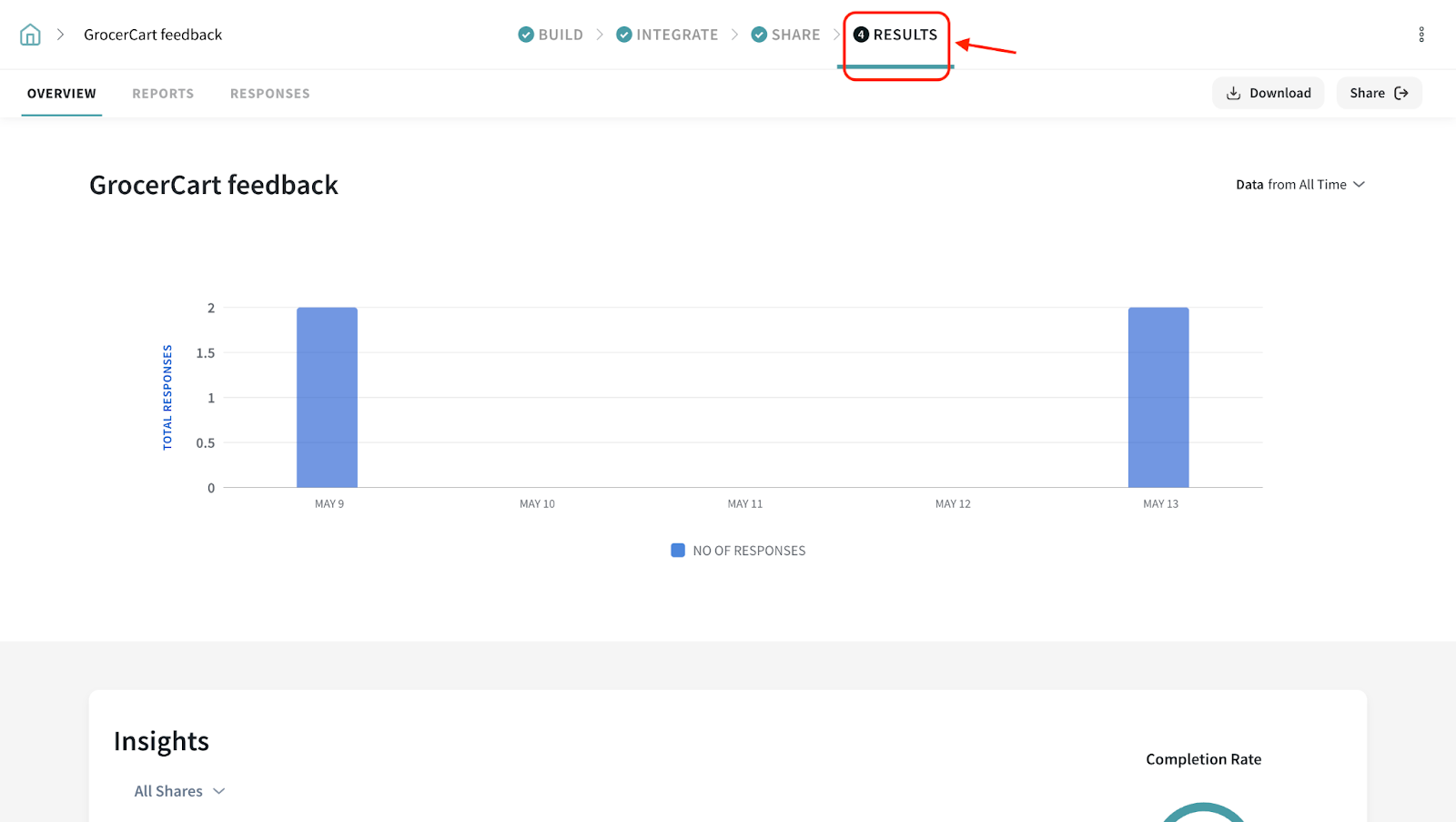 Once your survey starts receiving responses, the bot responses will be filtered and shown in a separate section.