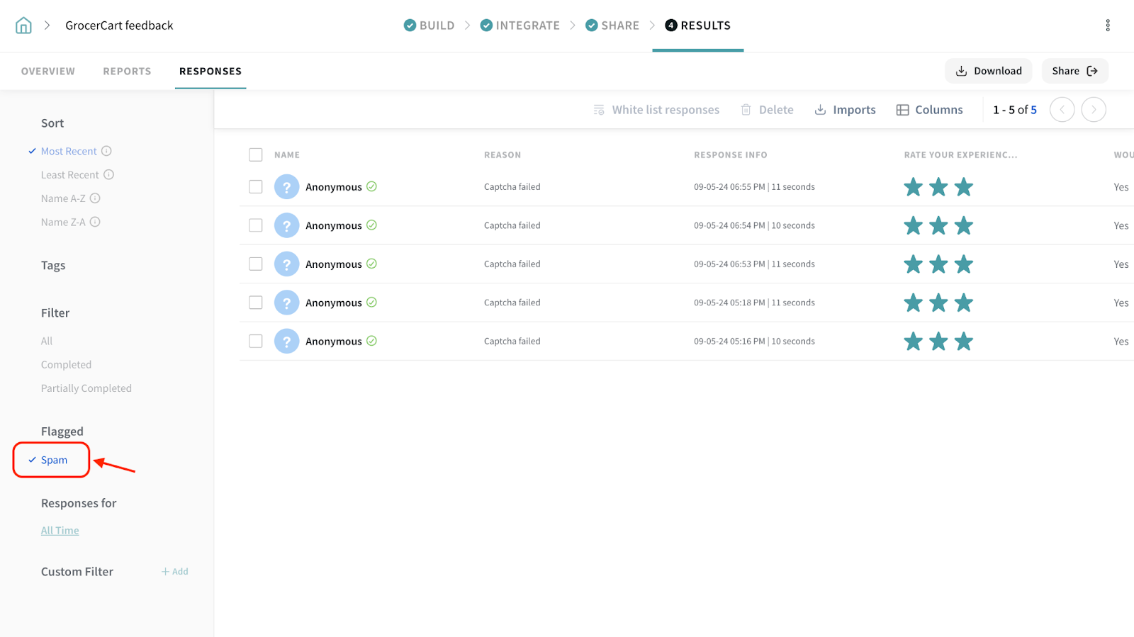 3. Under the Flagged section, select the Spam filter. All the spam responses will be shown along with the reason why they were marked as spam.