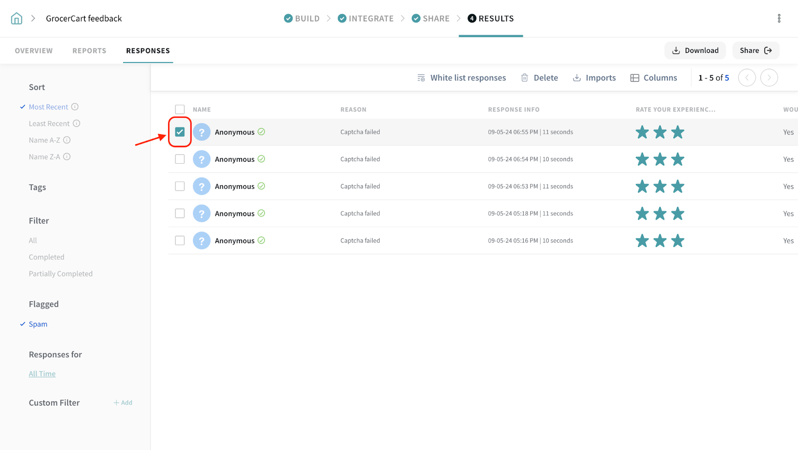 The white listed responses will be considered valid and included in the survey data analysis. In this way you can effectively manage survey data and steer clear of bot responses.
