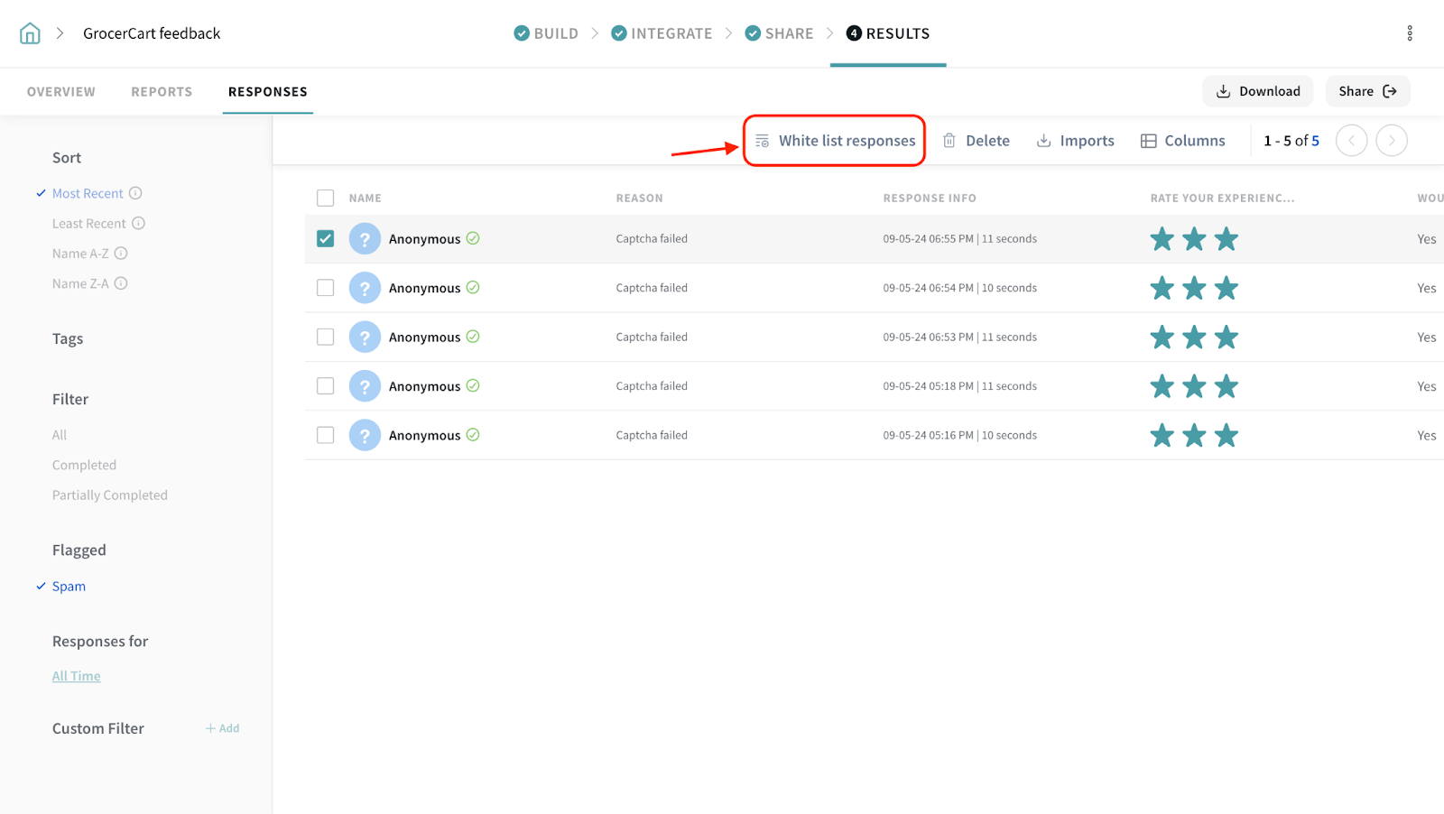 If you find a spam response marked incorrectly, you can choose to whitelist the same.