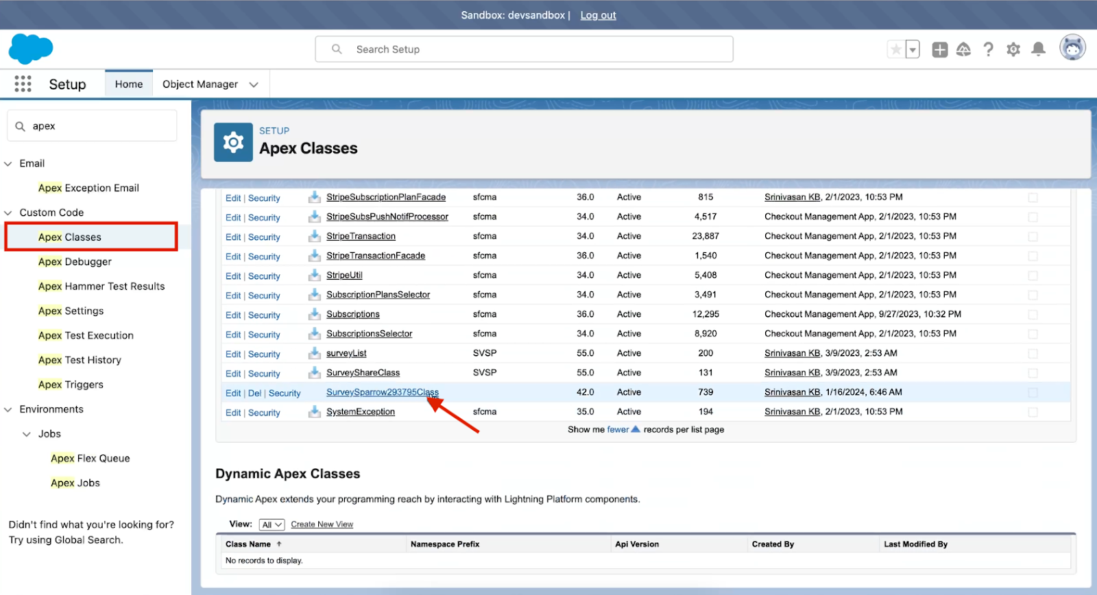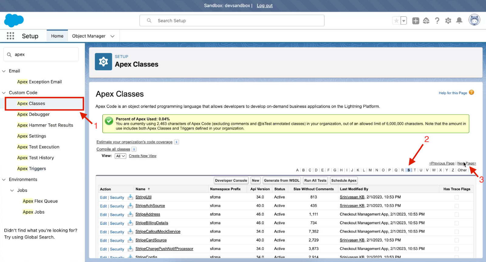 - Under the ‘S’ category in the Apex classes, go to the last page to find the most recently added classes.