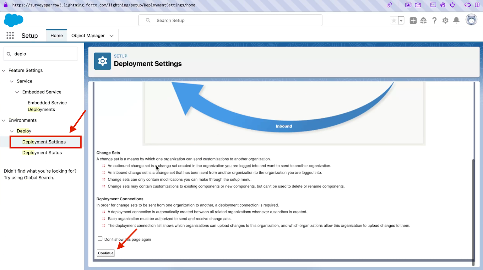- Search for ‘Deployment Settings’ and click ‘Continue.’