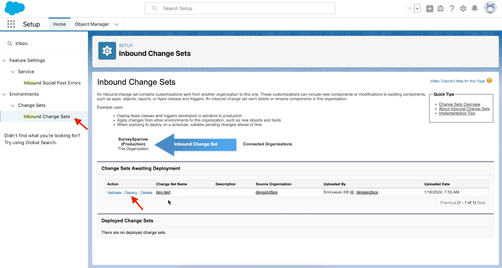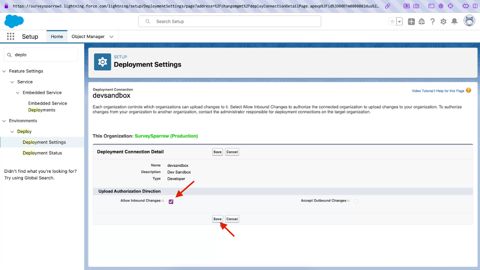 - Enable inbound changes in your Salesforce Production account to avoid any disruption while uploading the outbound change set.