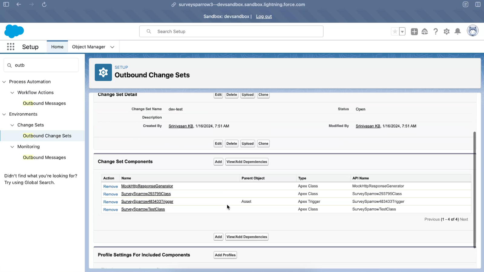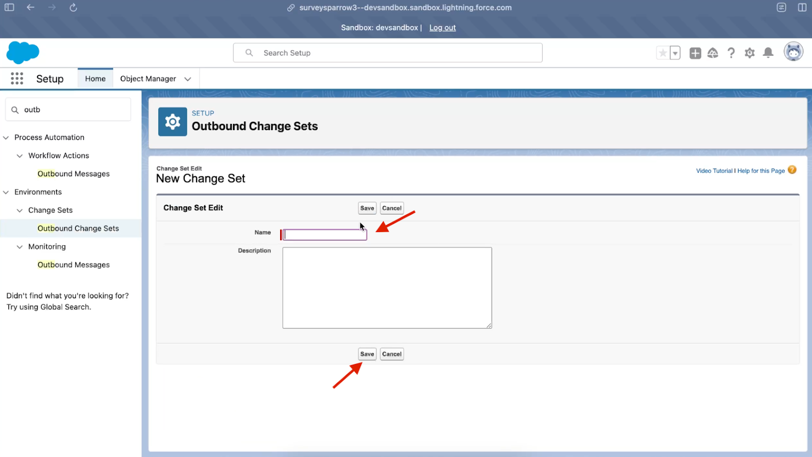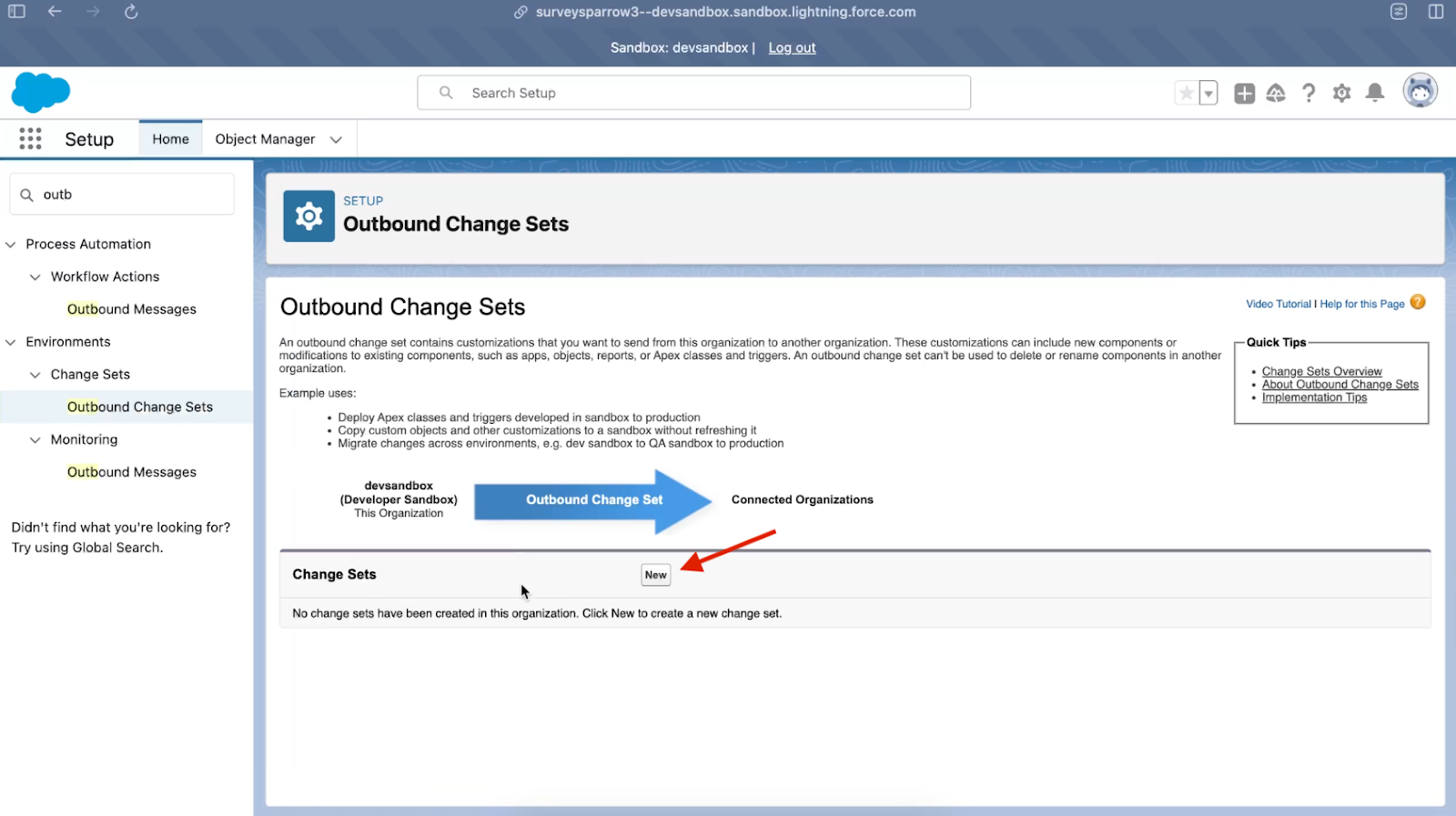 - In your Sandbox account, search for “Outbound Change Set” on the Setup page and click ‘Continue.’