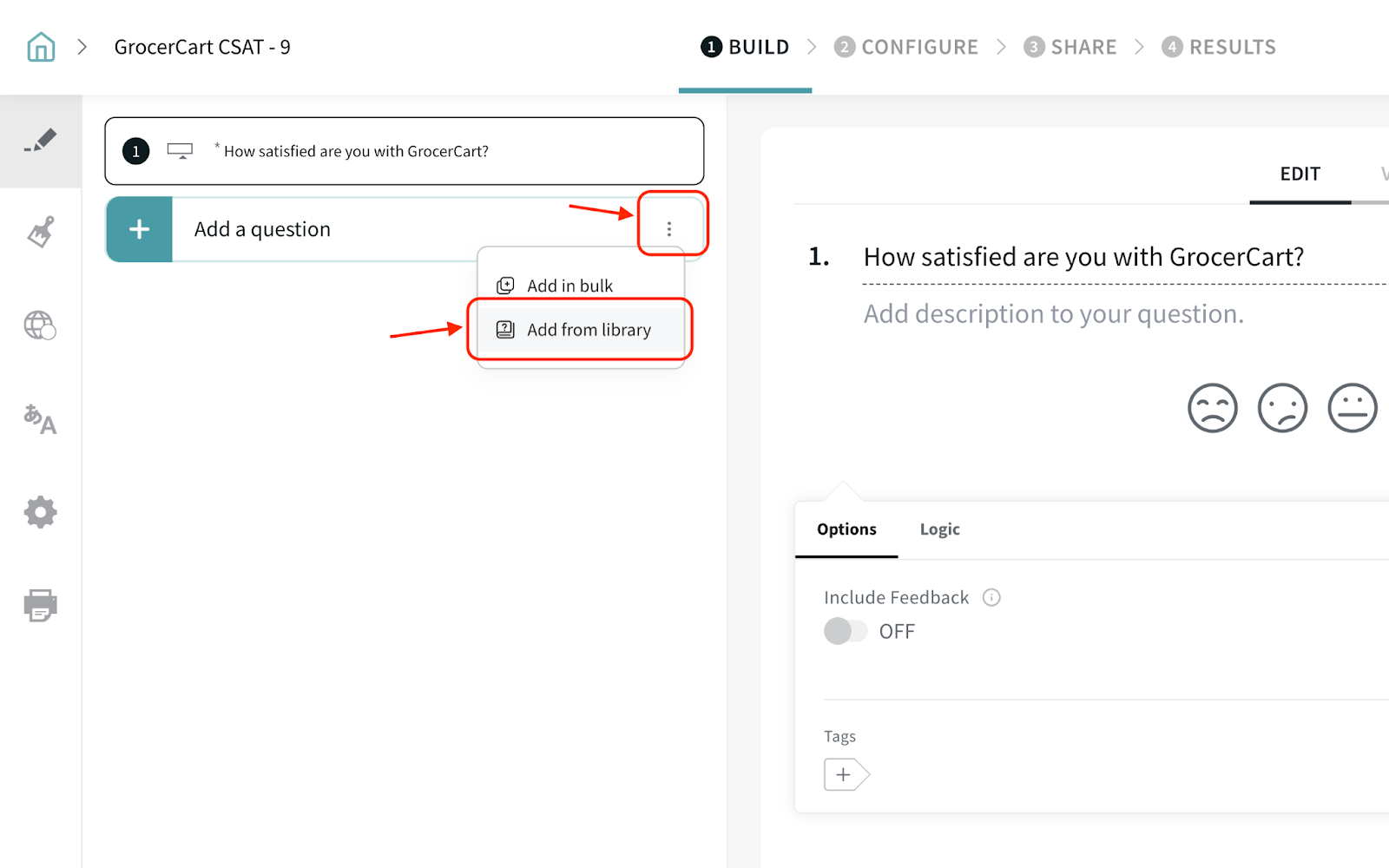 1. In the Build section of your survey, click the 3-dot icon on the Add a question button and choose Add from library.