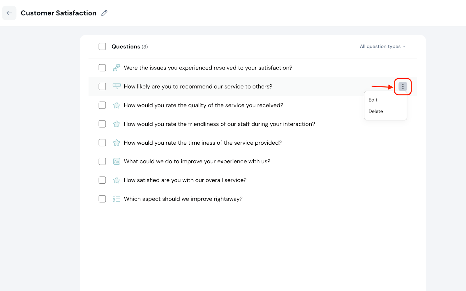 To edit or delete a question, hover over the corresponding question, click the 3-dot icon, and choose the respective option.
