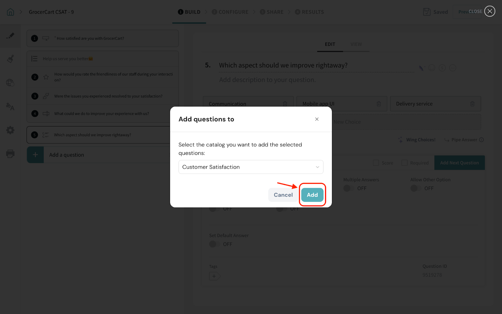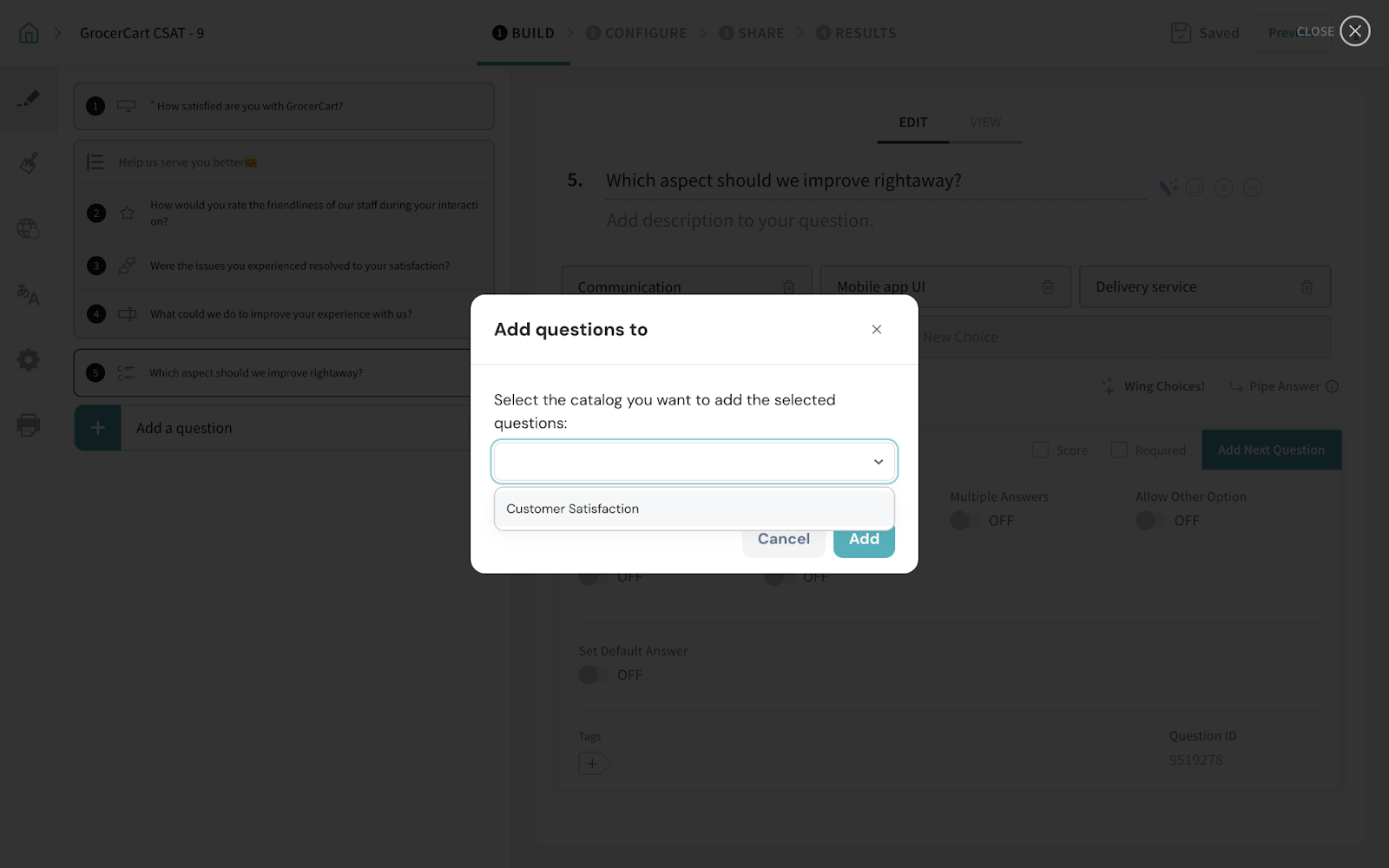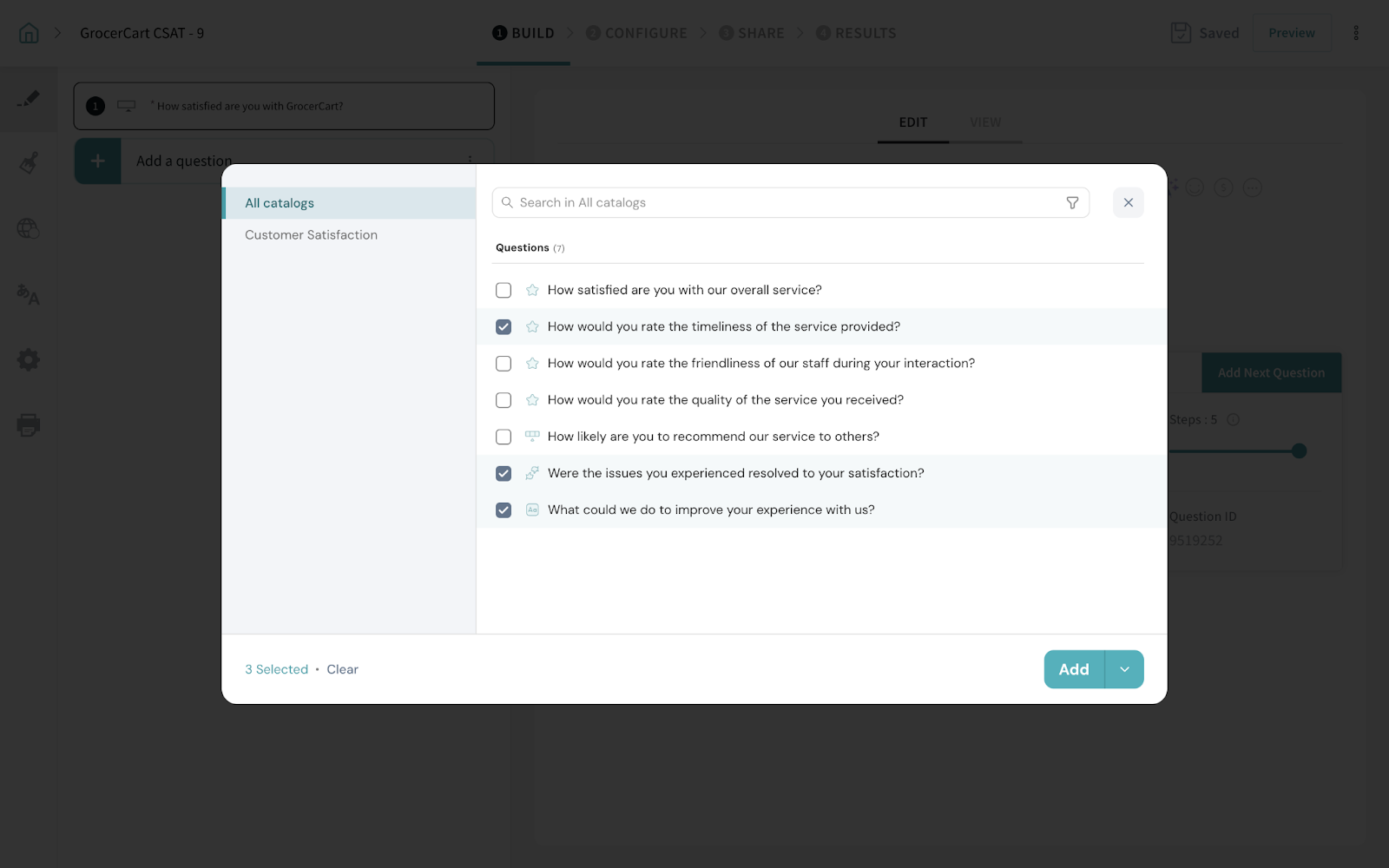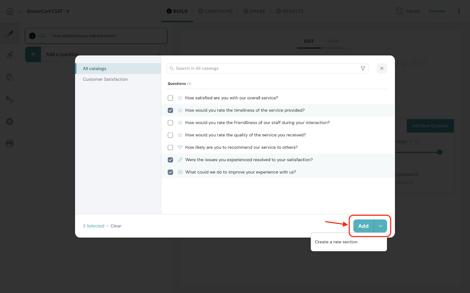 2. Navigate to the corresponding catalog and choose the question(s) that you’d like to add to the survey.