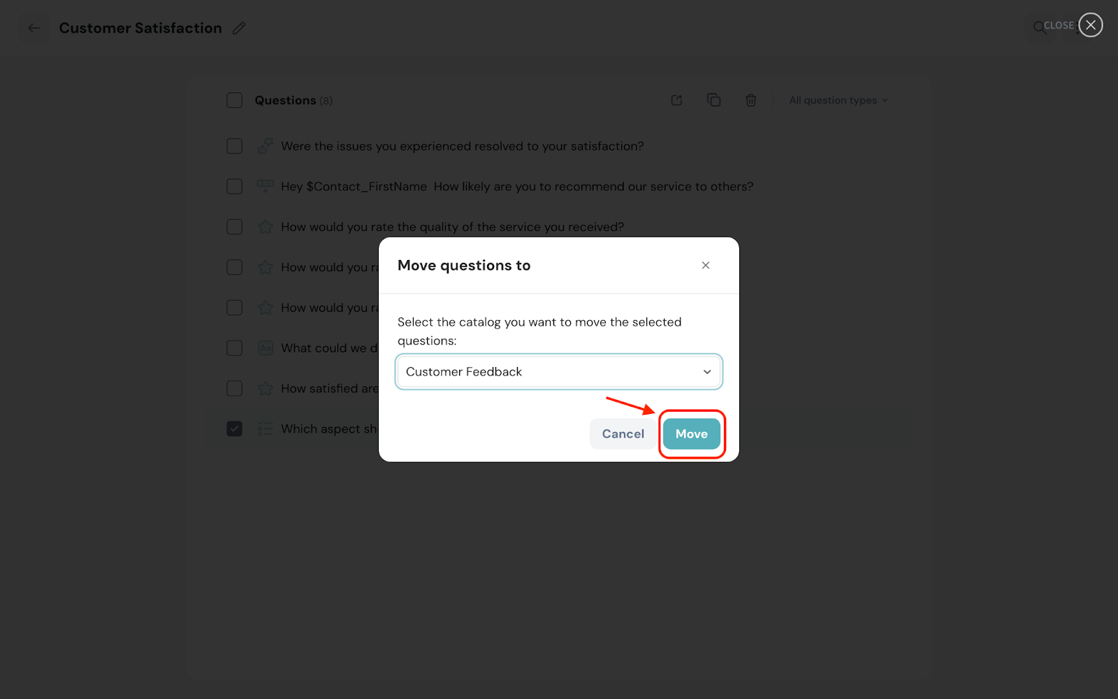 1. Open a catalog in your Question Library, select the question(s) you want to move, and click the highlighted icon as shown below.