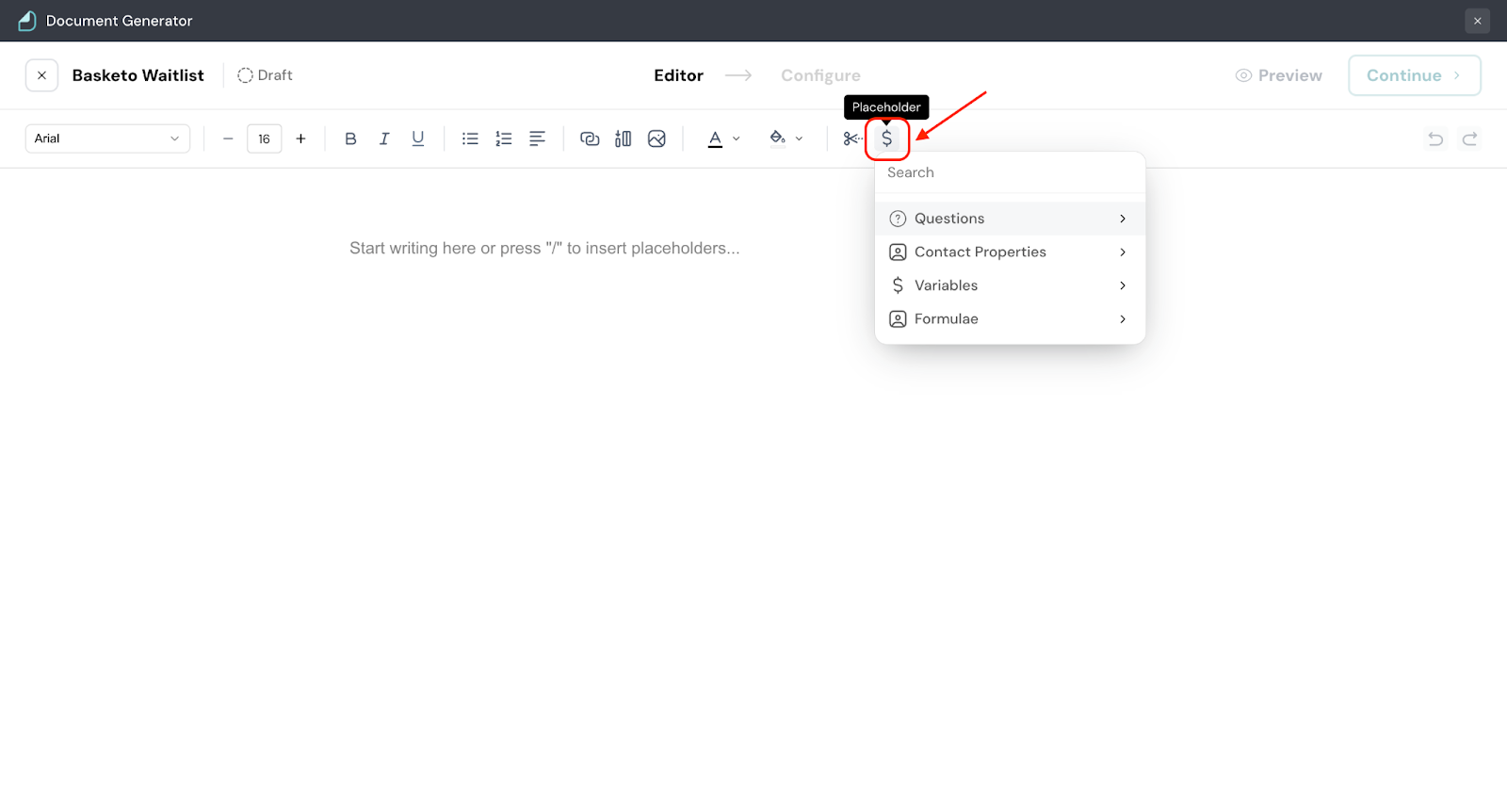 5. Click the $ sign to add placeholders to the document. Or, you can simply enter ‘/’ to access the placeholders.