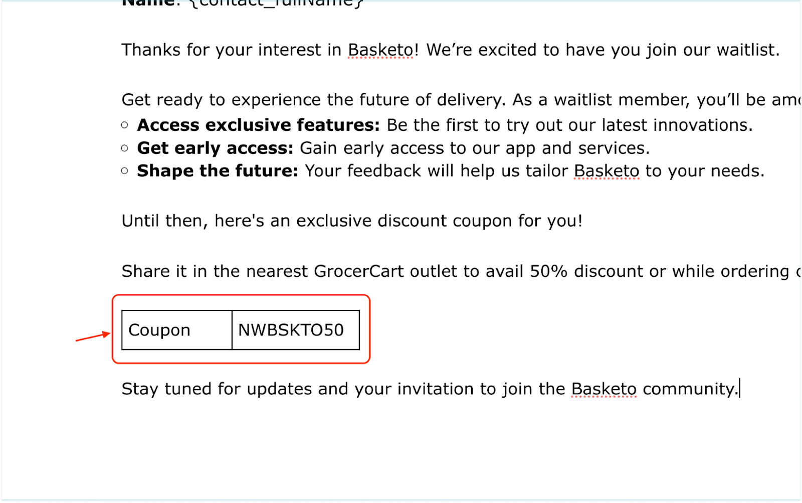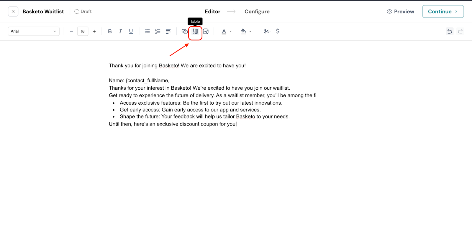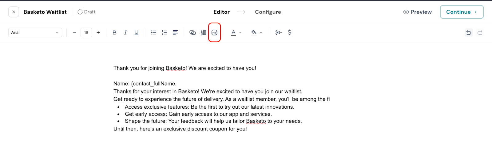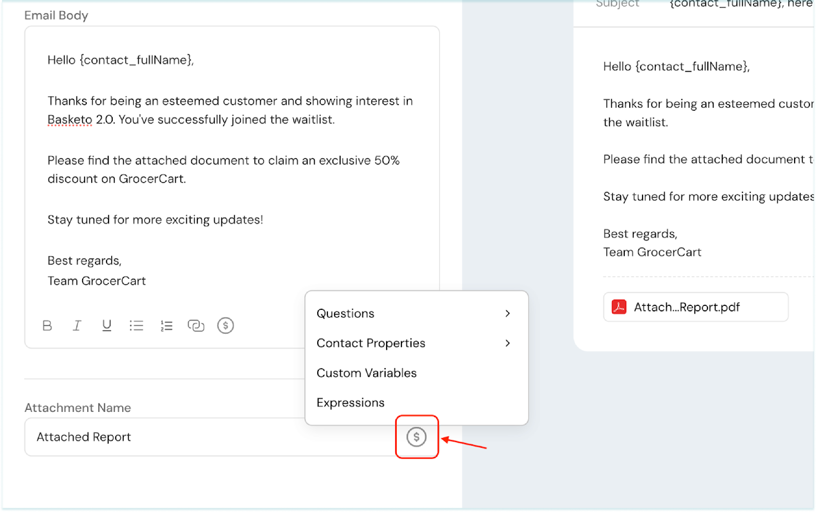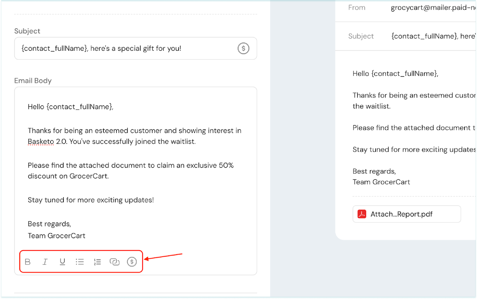 4. Now, edit the email body. Choose to format the text, add numbered/bulleted lists, add relevant links if needed, and click the $ to proceed with personalizing the email body.