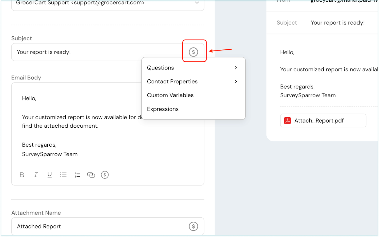 5. You can choose to keep the attachment’s name static or dynamic. Click the $ icon to add a personalized placeholder. You can choose from Questions, Contact Properties, Custom Variables(if added to the survey), and Expressions(if added to the survey).