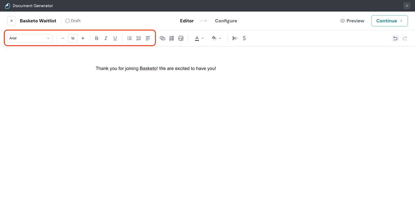 6. Adhere to your brand guidelines and format the document. Choose font style, font size, make your text Bold, Italics, or Underline. You can add numbered lists or bulleted lists to your document. Select an alignment to indent the document.