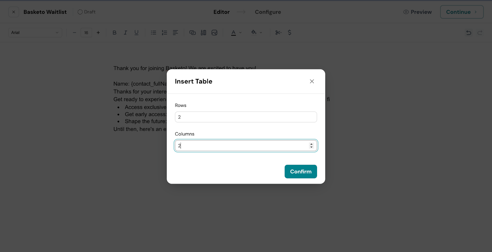 2. Enter the number of rows and columns you need for your table.