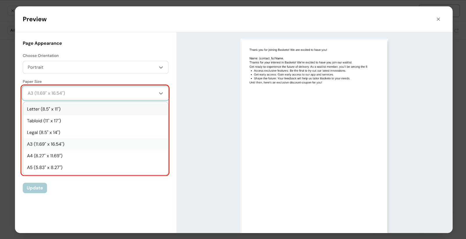 3. Select a paper size from the available options.