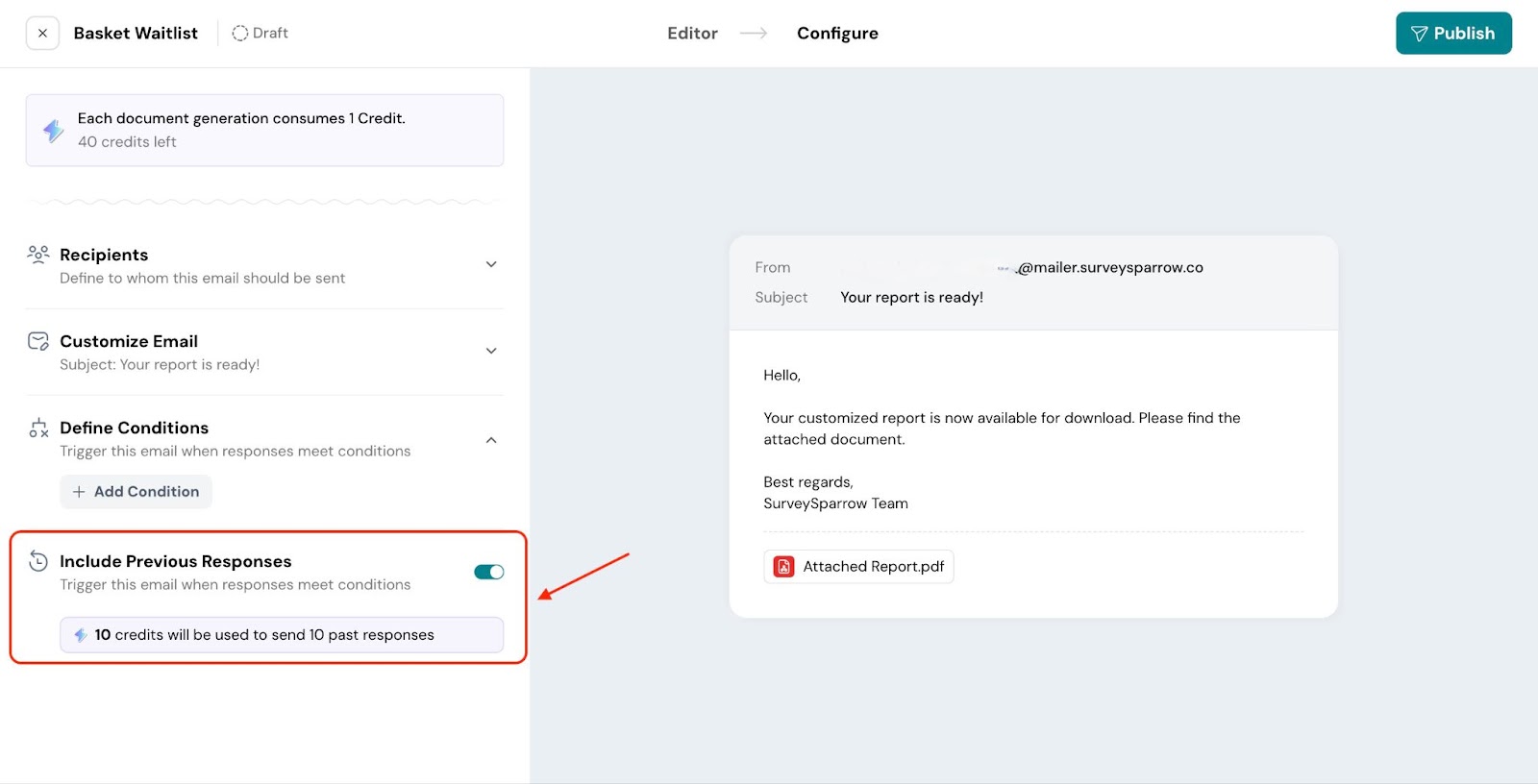 7. Include Previous Responses: Use this option to send the email for previous responses that meet the defined conditions. If the responses match, the email will be triggered even if they were submitted earlier.