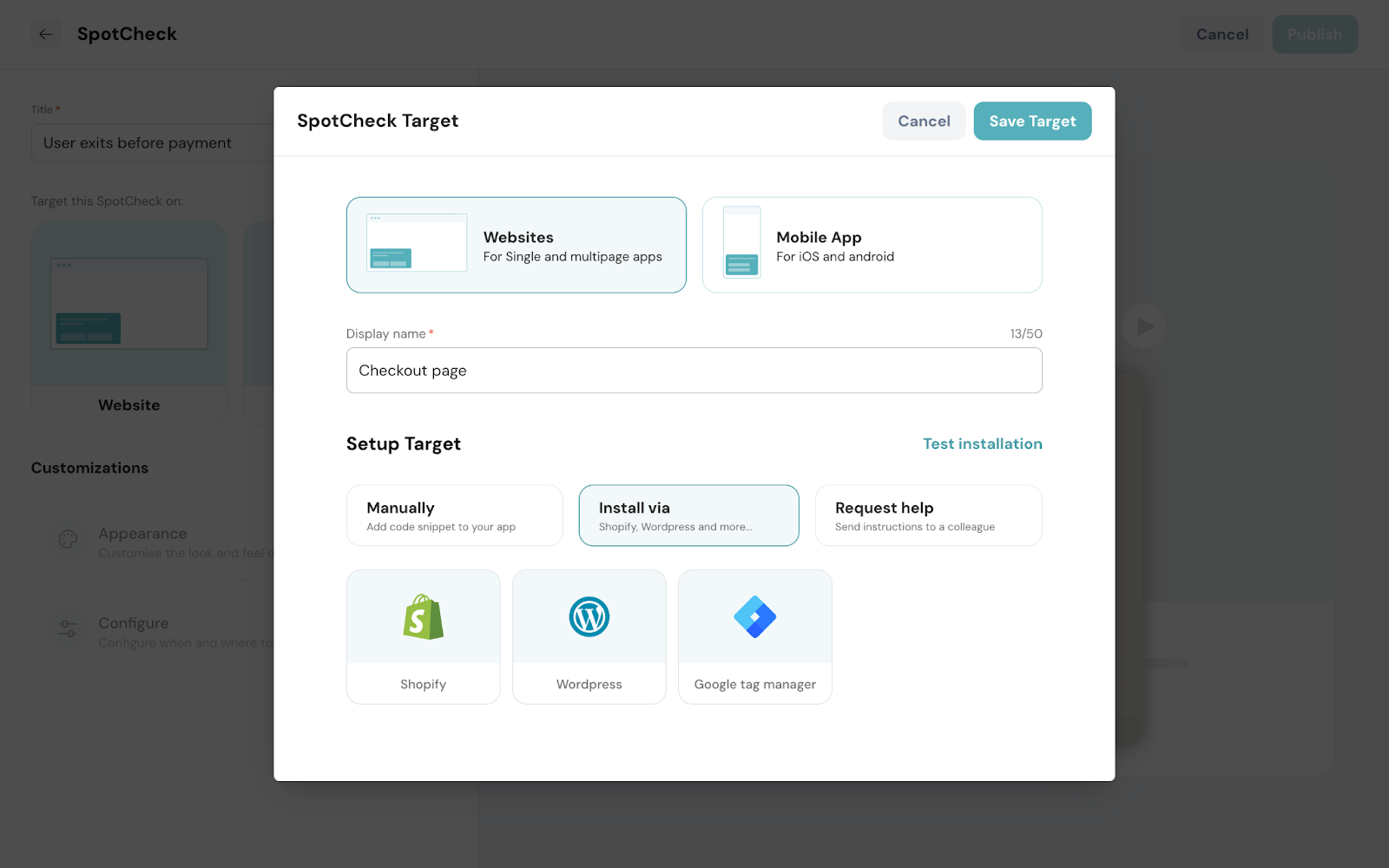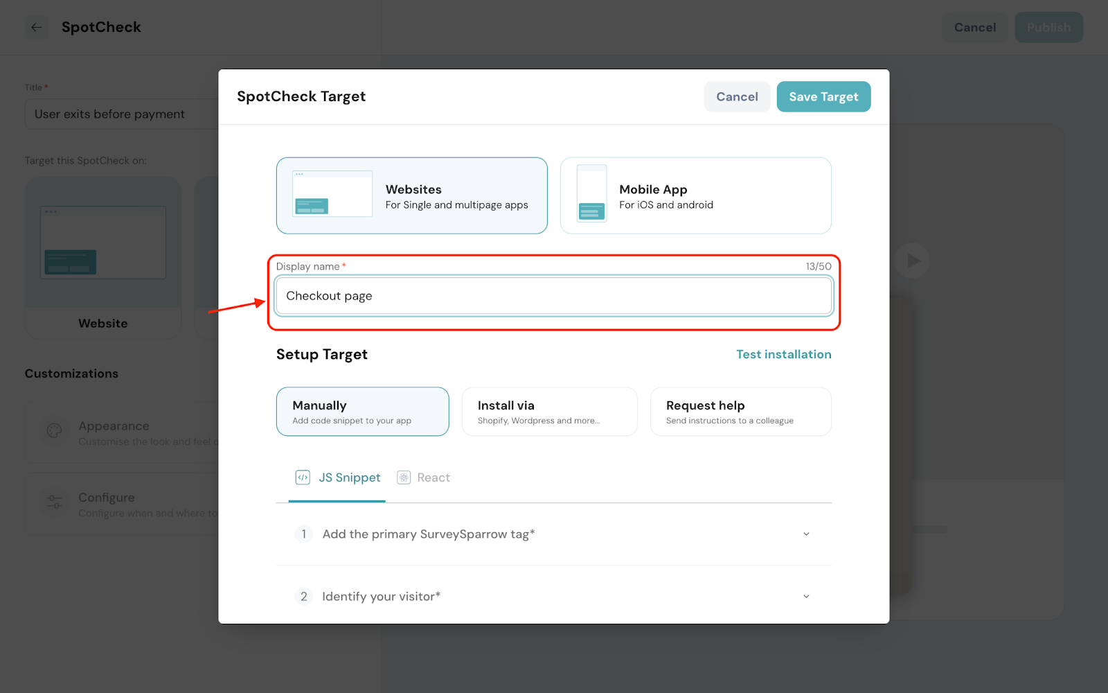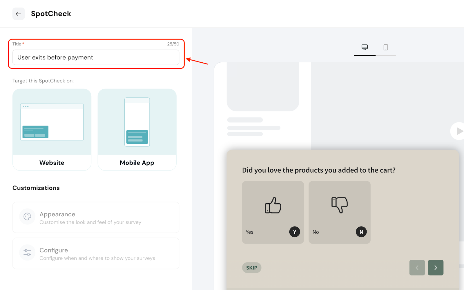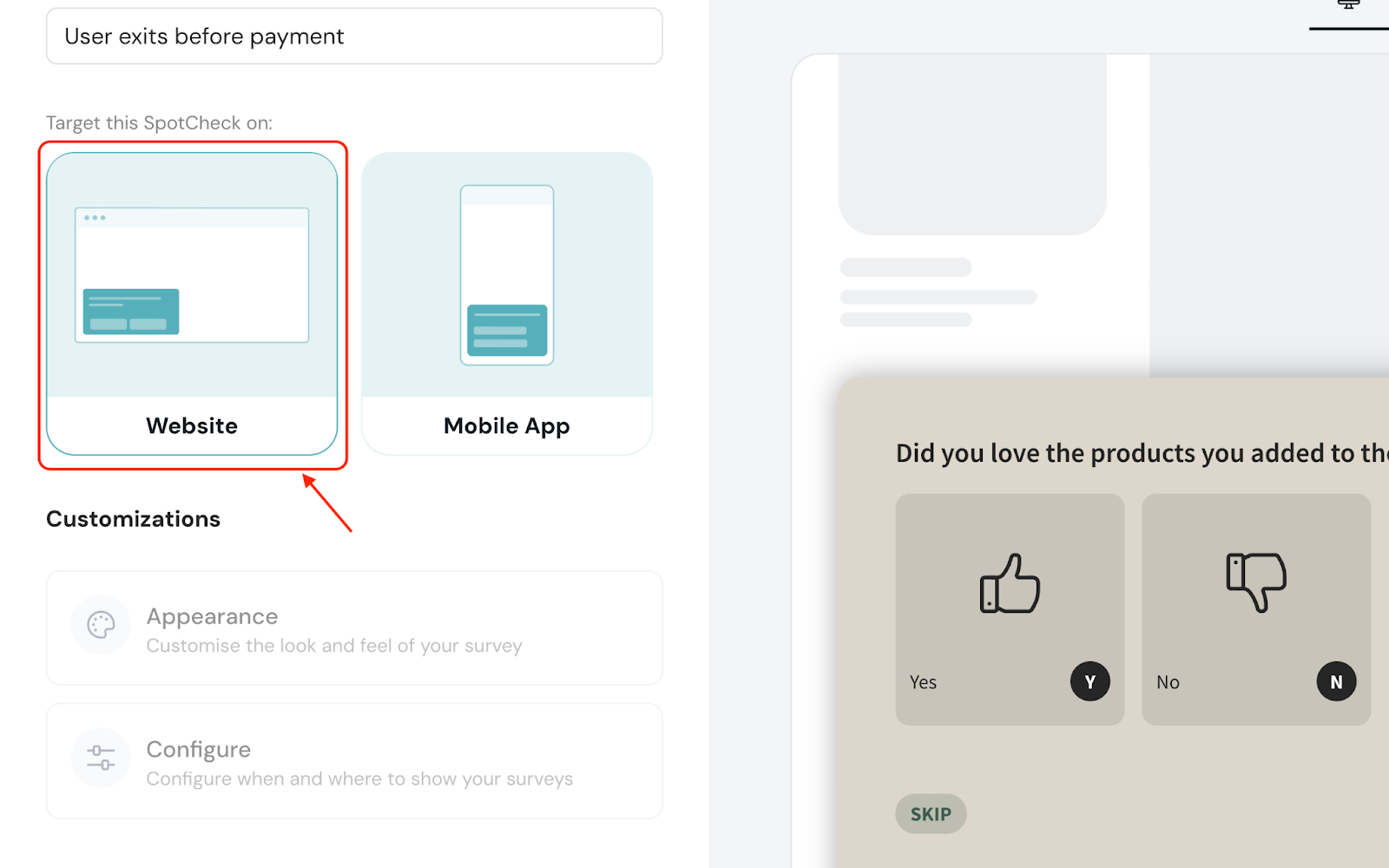Target determines the place(s) where you’d like to run the microsurveys. In this case, the webpage(s) of a website is the target.