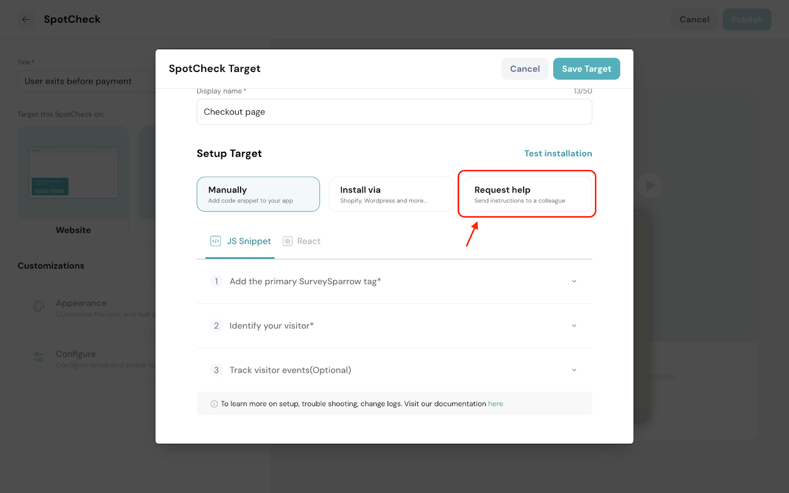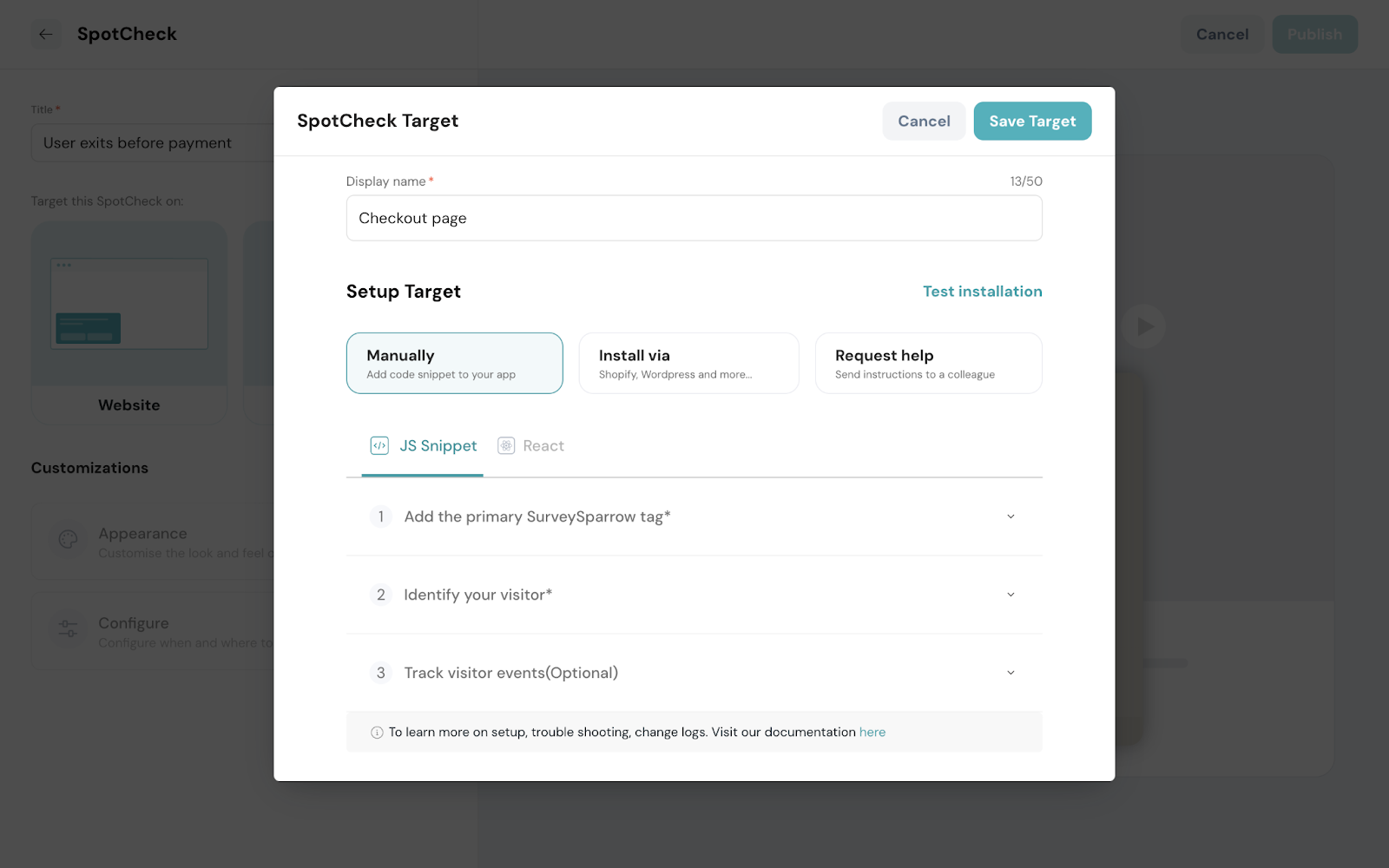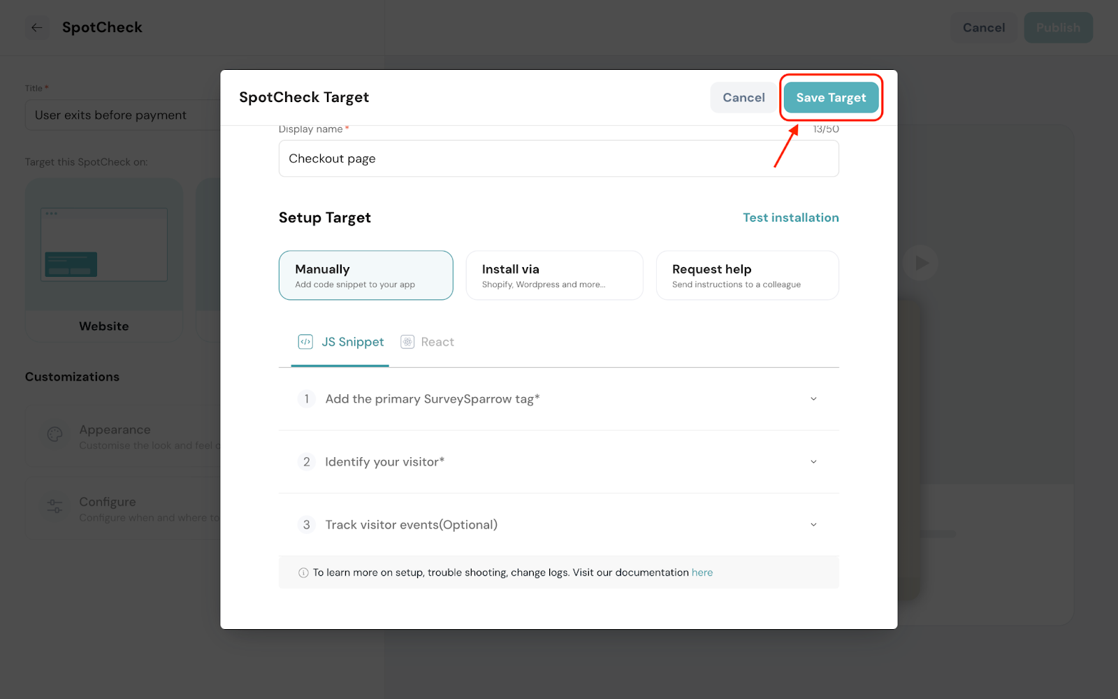 The best part? It’s a one-time deployment which means after adding the code to your website, you can make any changes to the SpotChecks in SurveySparrow, and see it live in action without copy-pasting the code every time!