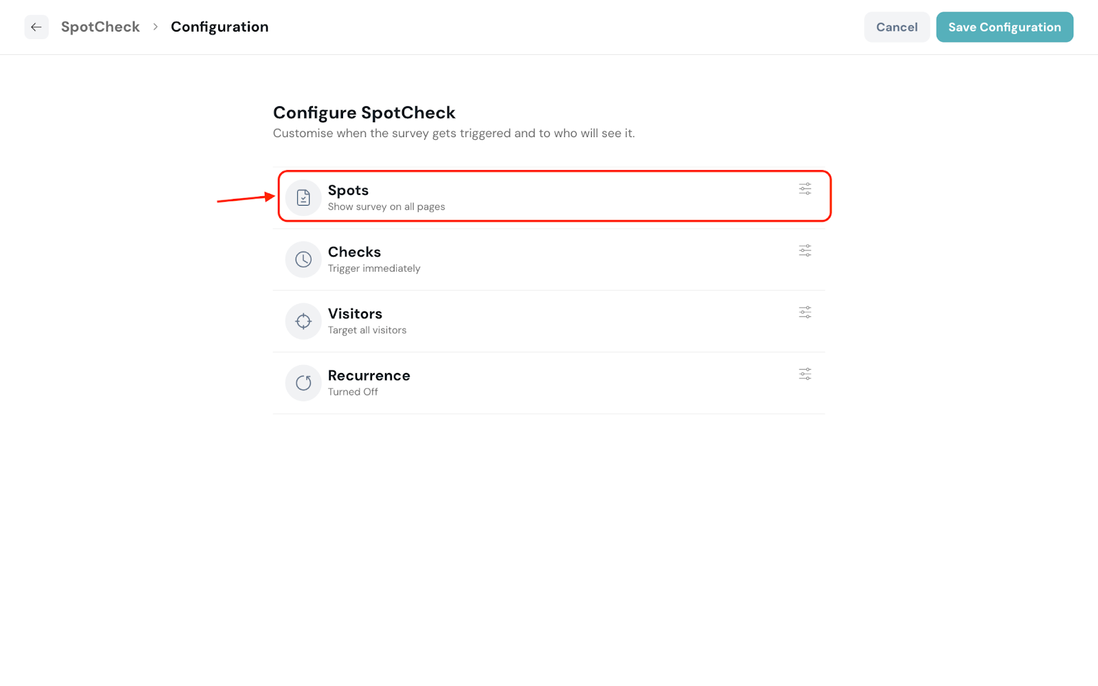 2. Click Spots to set where you want the SpotCheck to be triggered.
