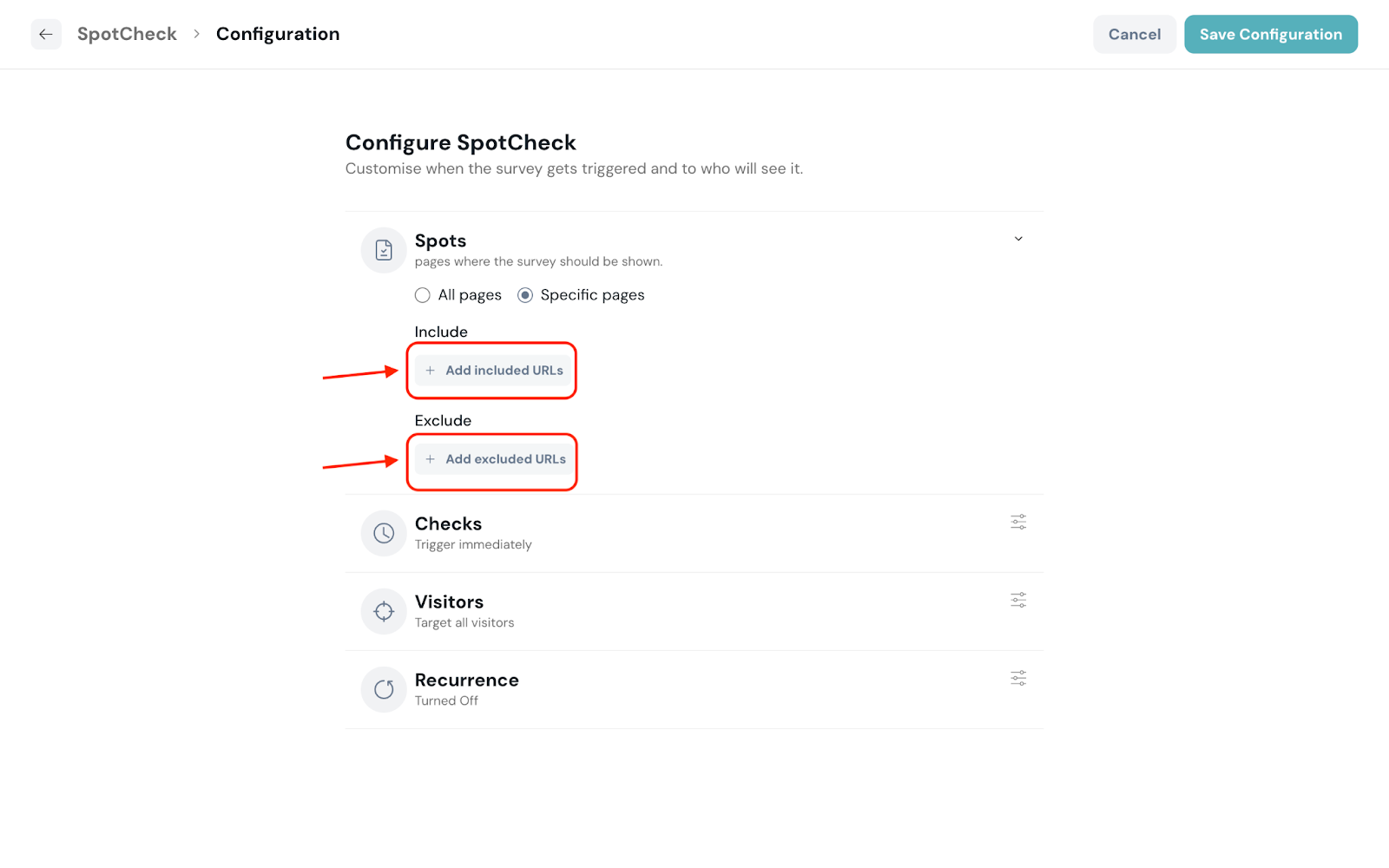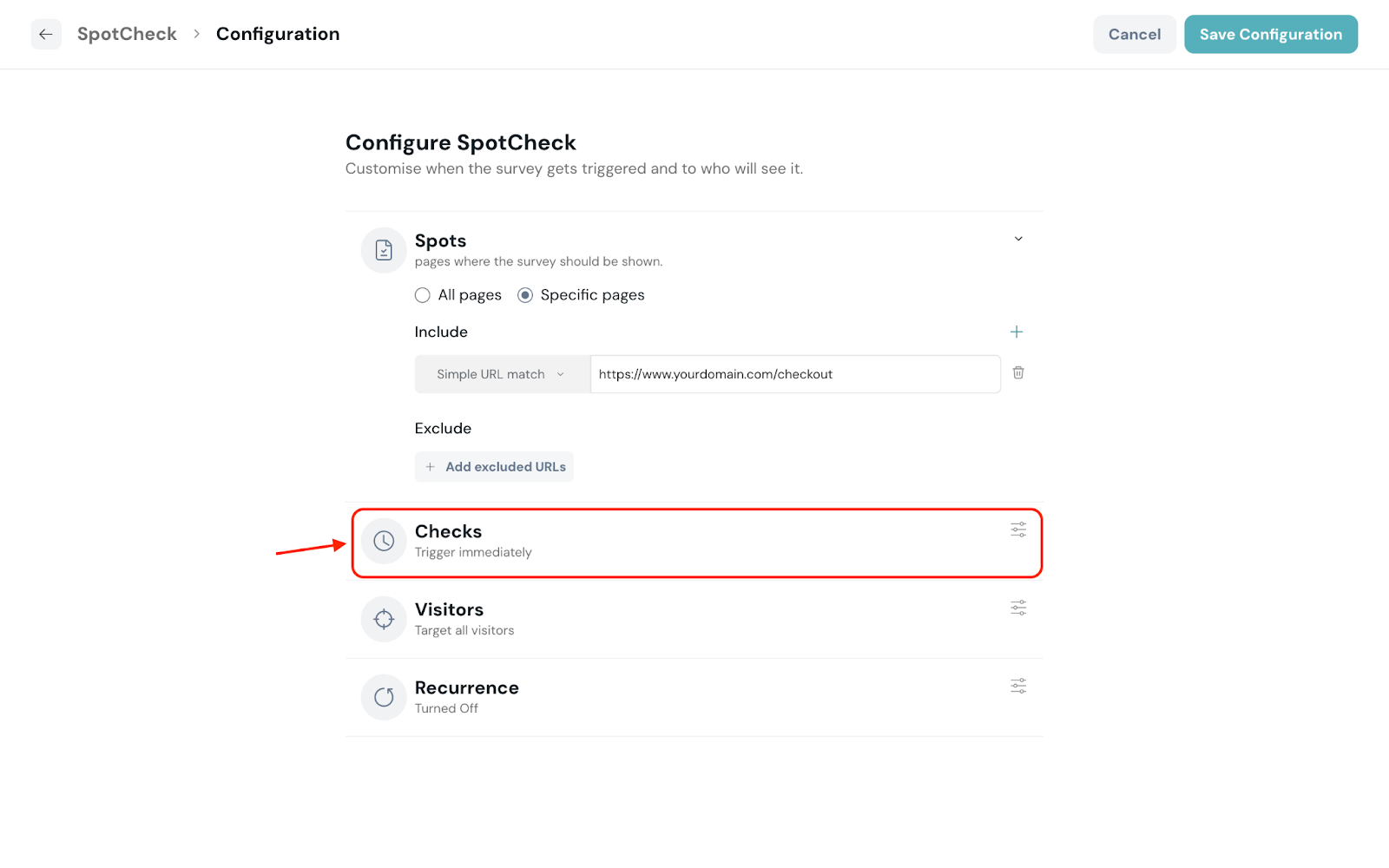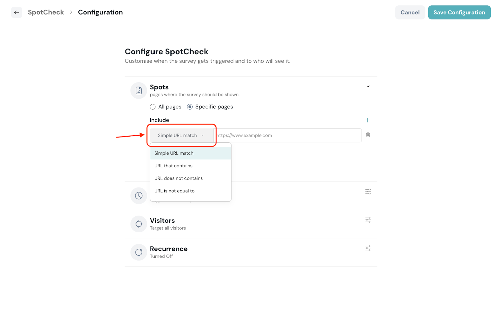 Simple URL match: Display/Not display SpotCheck when the URL exactly matches a specific page
