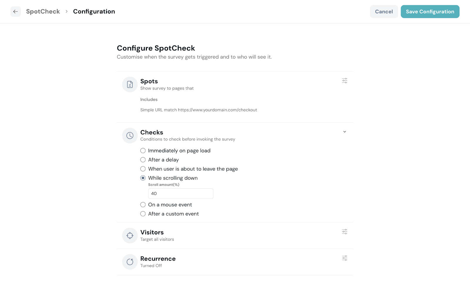 - While scrolling down: Enter the scroll percentage amount after which the SpotCheck should be shown.