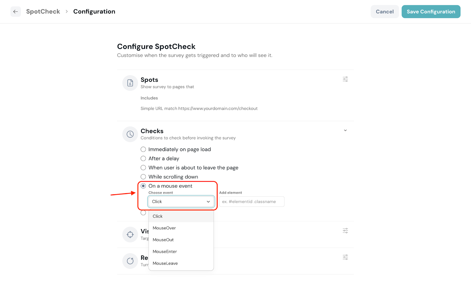 - On a mouse event: Choose from the available mouse events to trigger the SpotCheck.
