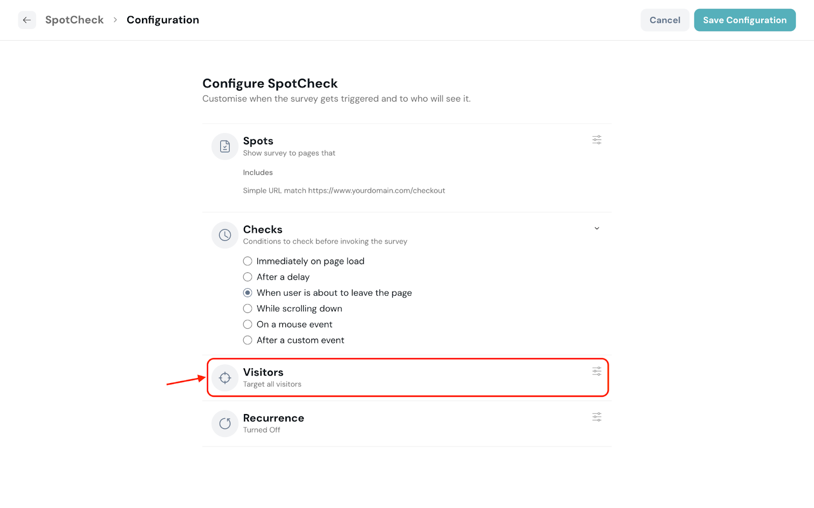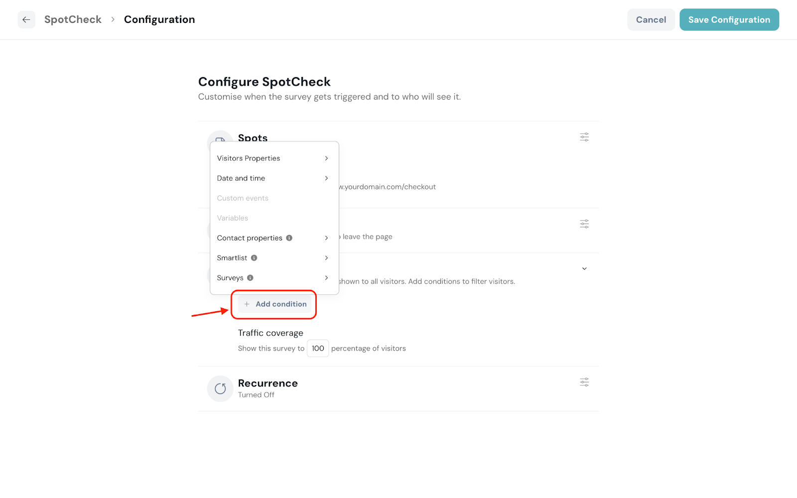 - Surveys: Select a survey’s response status of the visitor to show the SpotCheck. (Ensure you identify visitors using their email address in your code snippet)