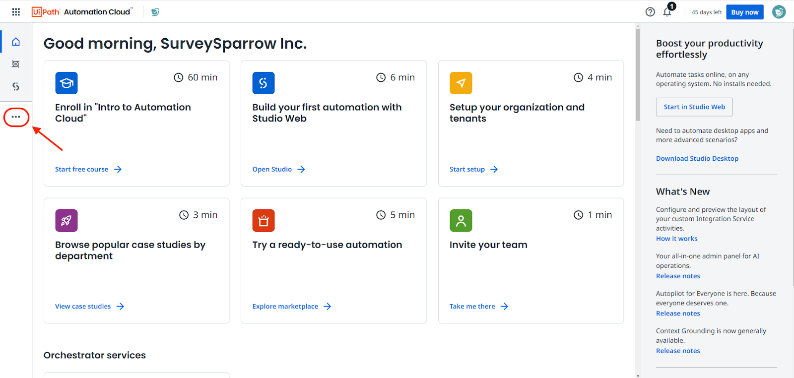- Log into your UiPath account, then click on the 3 dots in the left panel to open a menu.