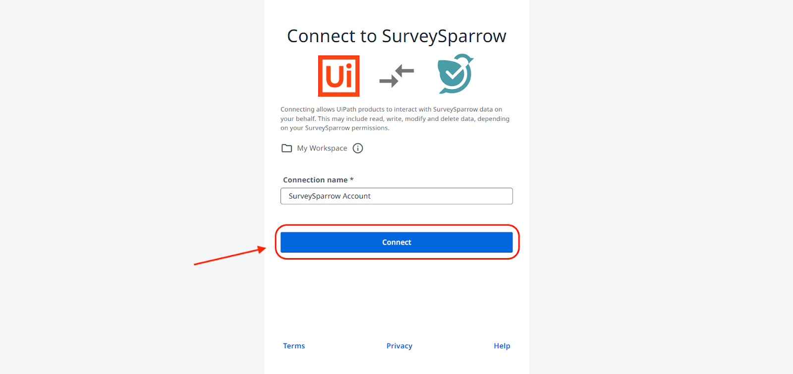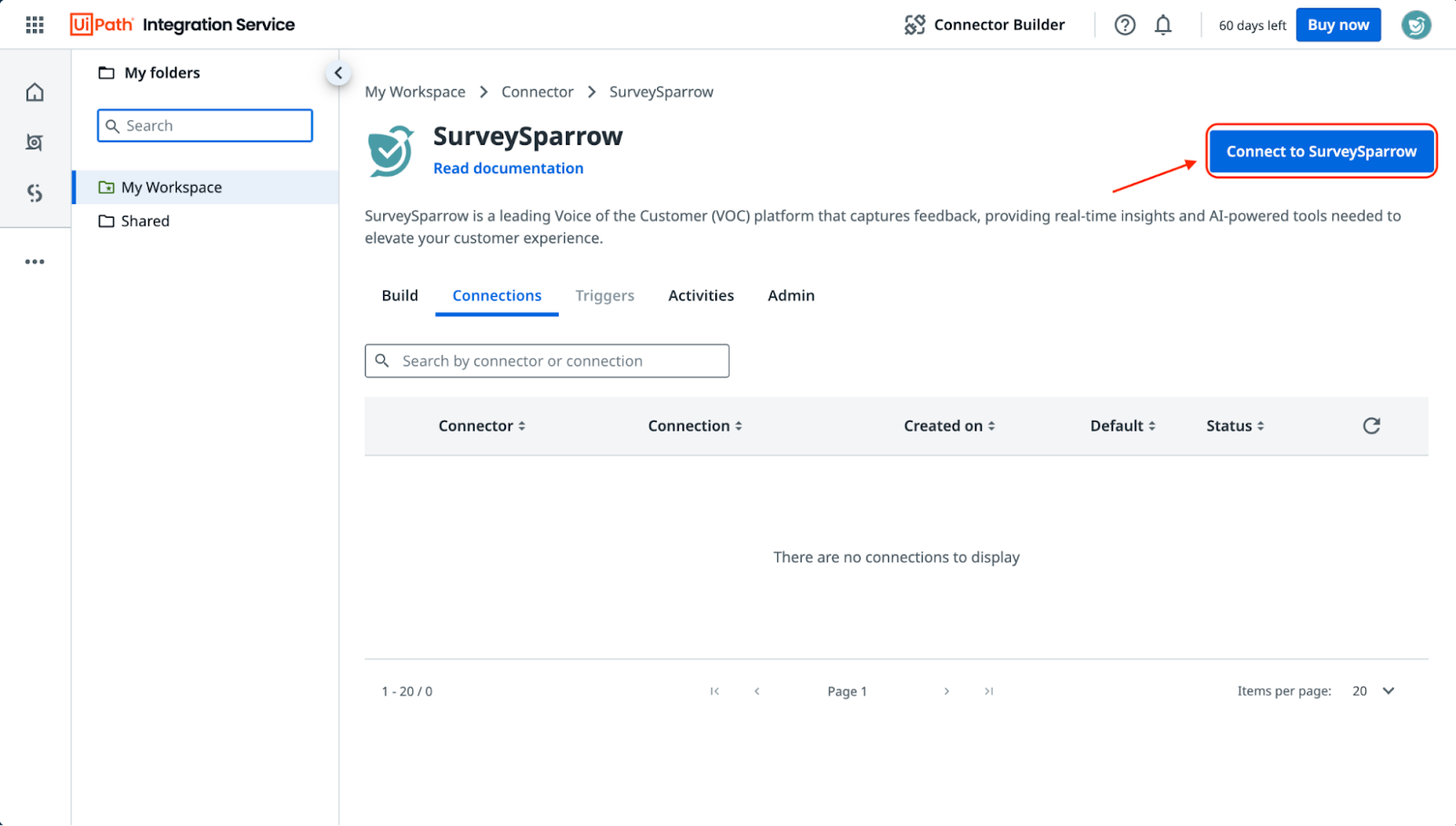 - Now the SurveySparrow connector is ready! It’s time to connect your SurveySparrow account to UiPath. Click Connect to SurveySparrow.