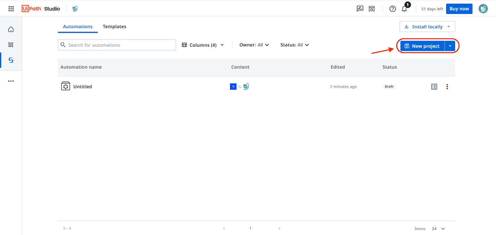 - When the Studio opens, click on the Automations tab, then click New project.