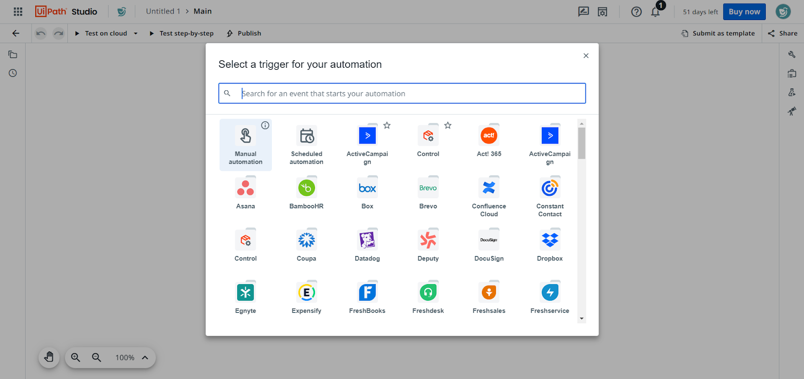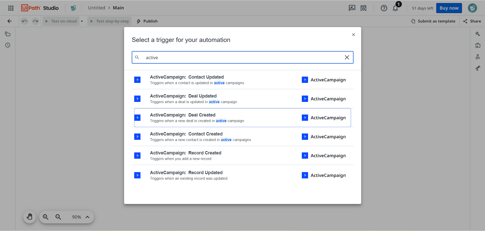 - You will be asked to select a trigger for your automation. If your desired connector is visible in the list, click on it, or type its name in the search box. In this case, we will be searching for ActiveCampaign’s connector.